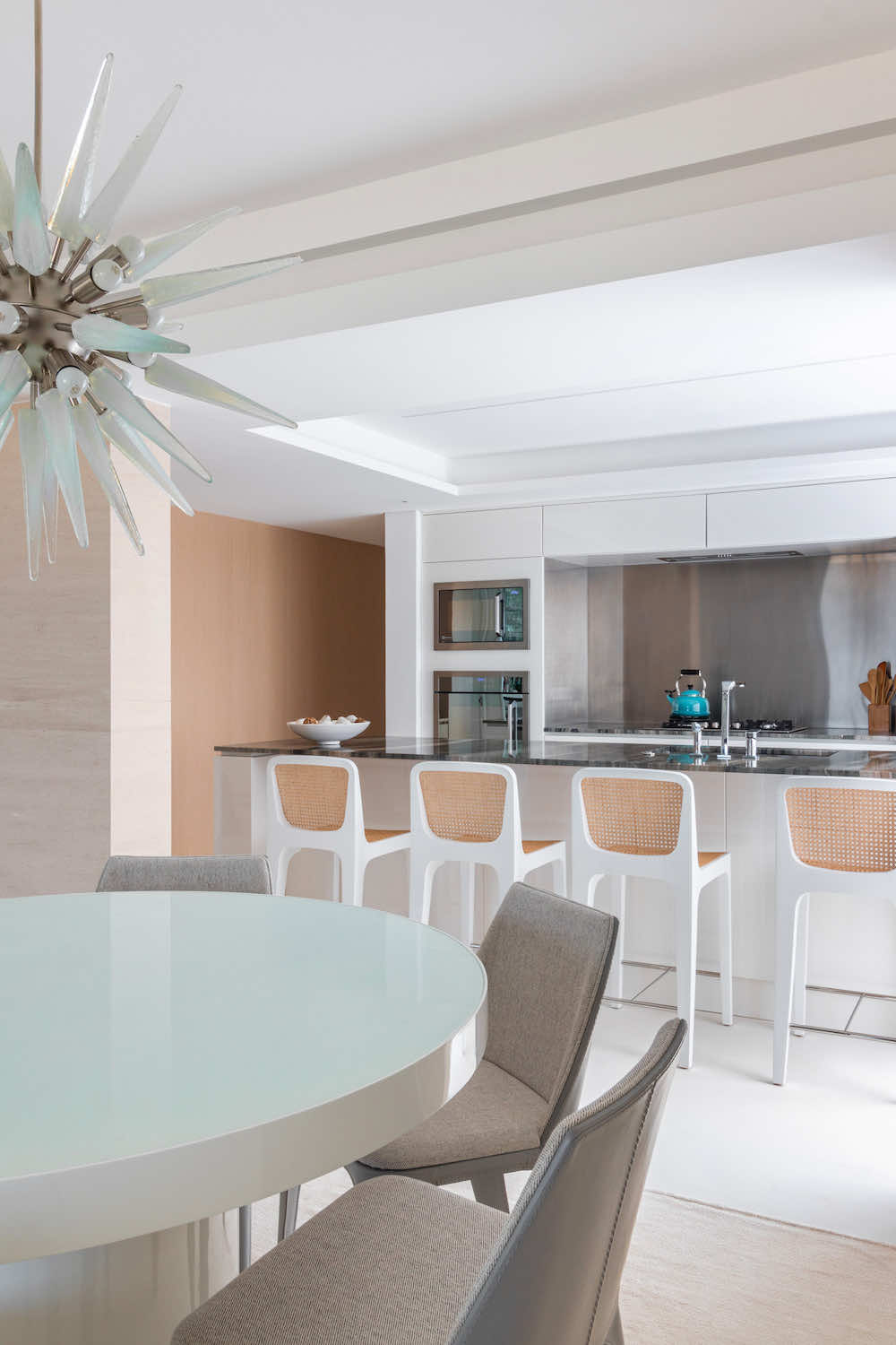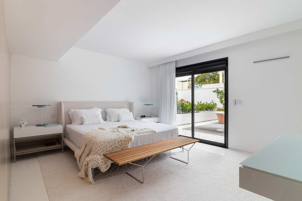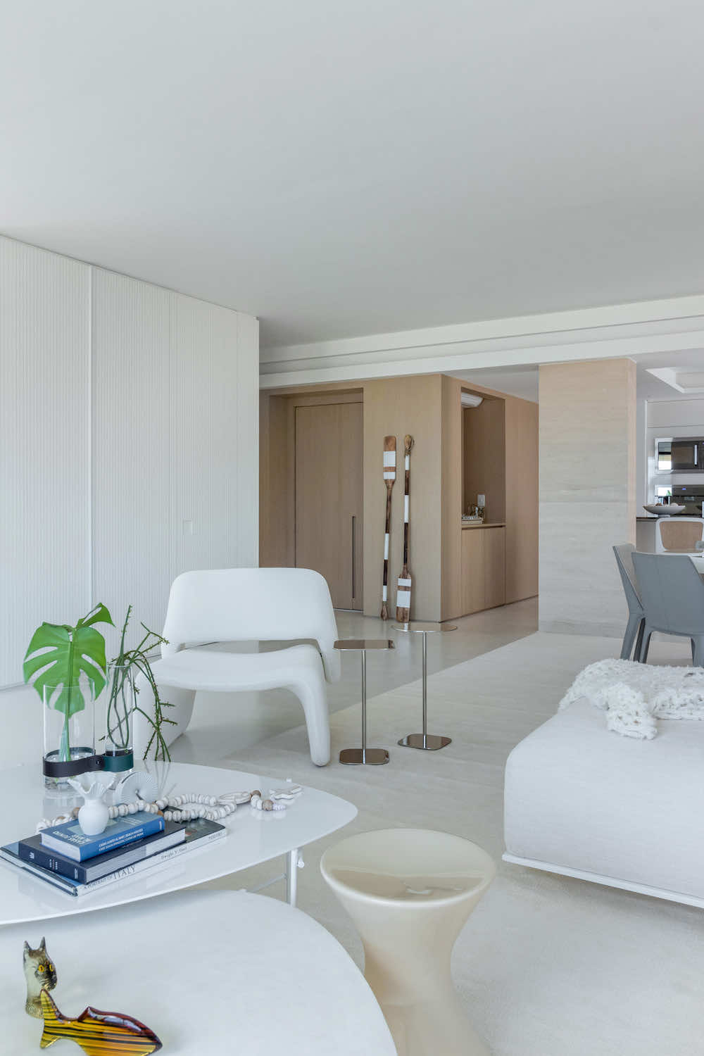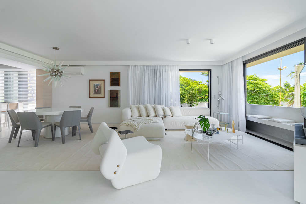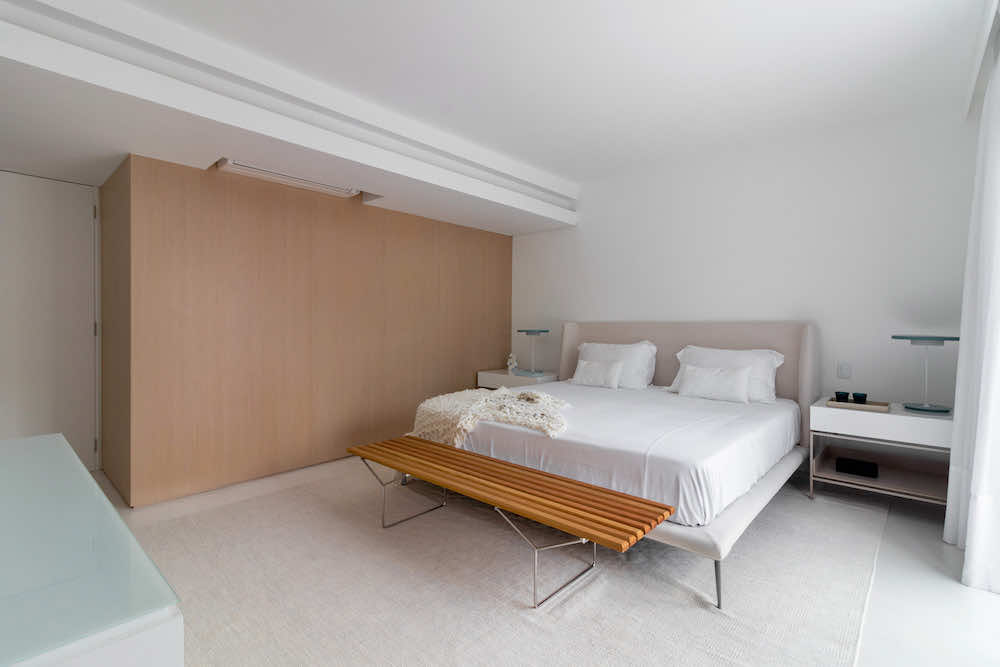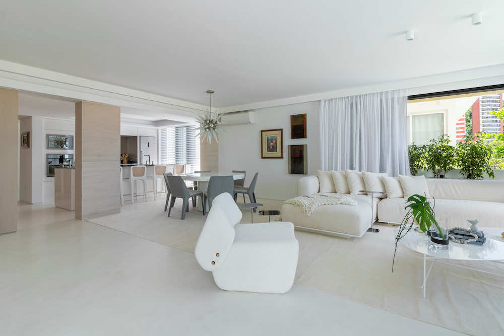 Em apenas 7 meses, o ambiente foi completamente reformado, havendo a troca de esquadrias, elétrica, hidráulica e sistema de gás. Os quatro quartos também se tornaram apenas duas grandes suítes com closet. Foram utilizadas diferentes texturas e tons de branco, além de mobiliário assinado por designers renomados.