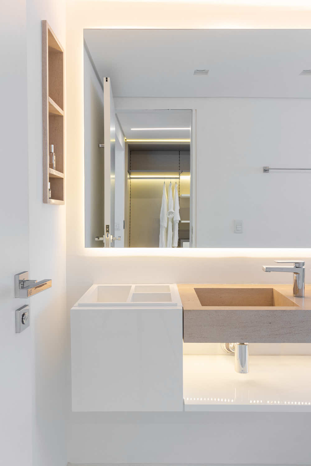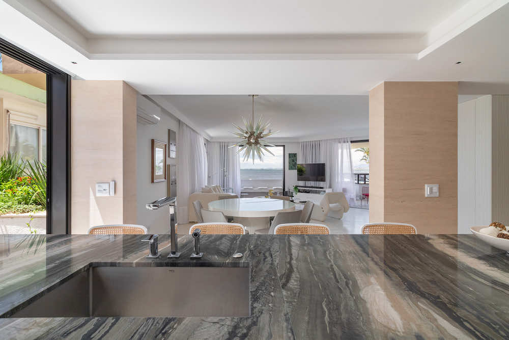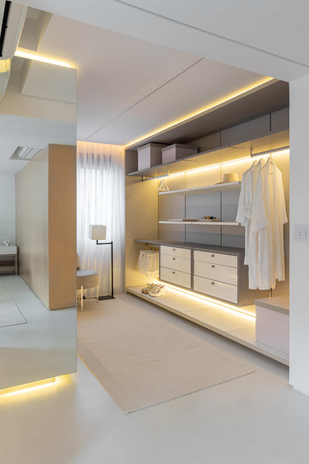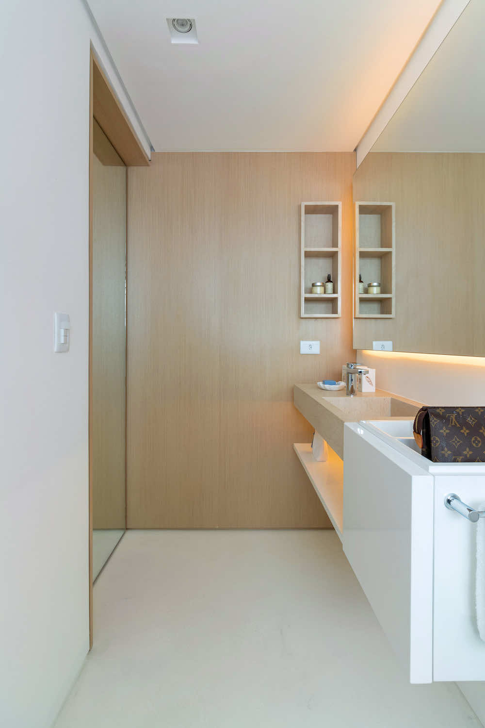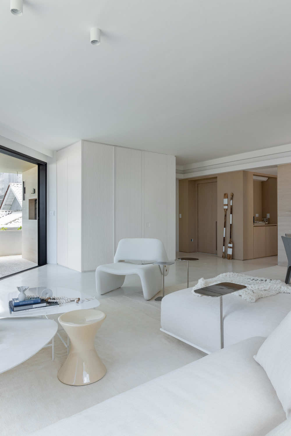 Em apenas 7 meses, o ambiente foi completamente reformado, havendo a troca de esquadrias, elétrica, hidráulica e sistema de gás. Os quatro quartos também se tornaram apenas duas grandes suítes com closet. Foram utilizadas diferentes texturas e tons de branco, além de mobiliário assinado por designers renomados.