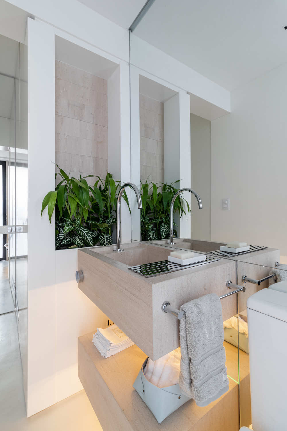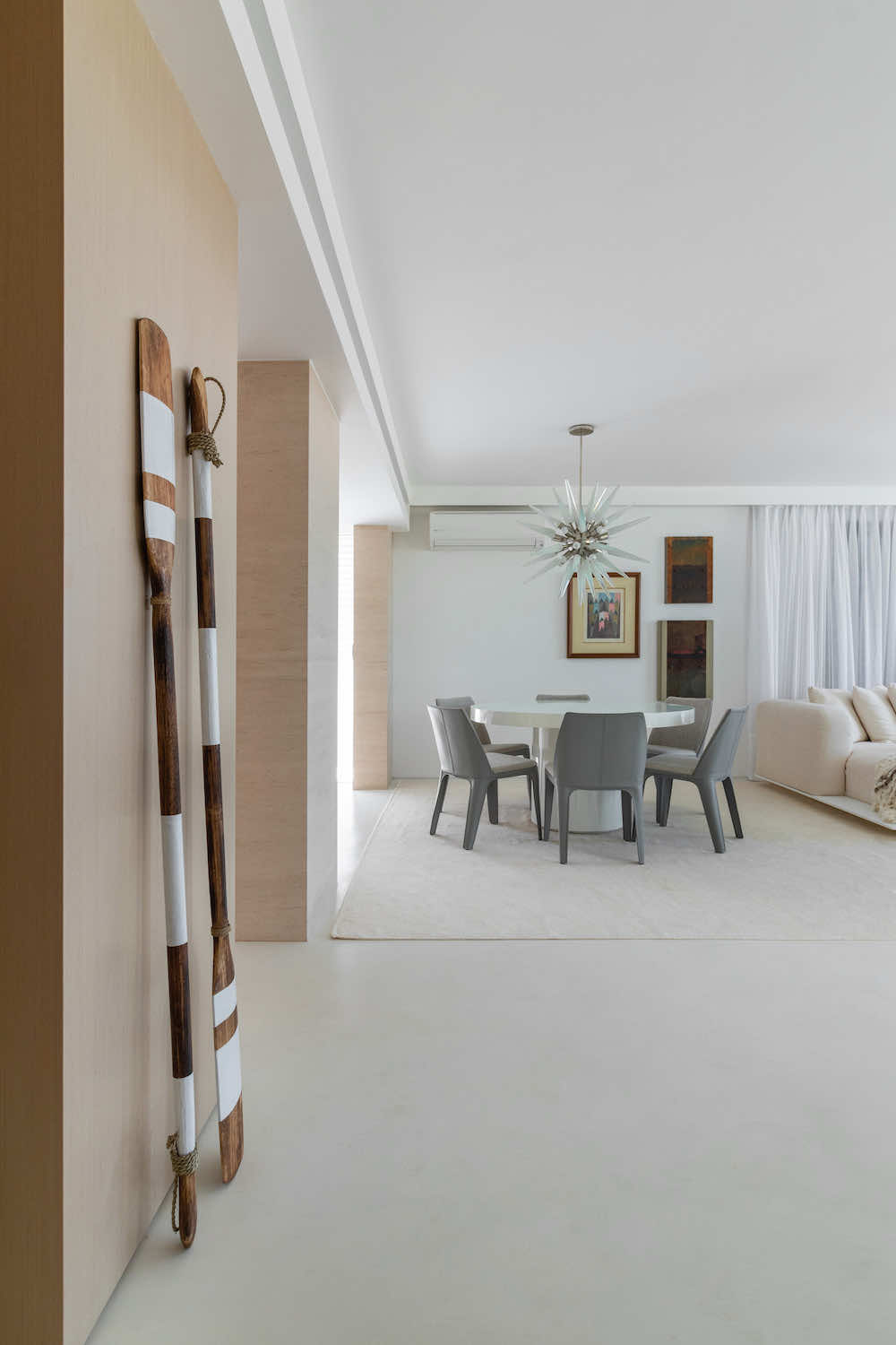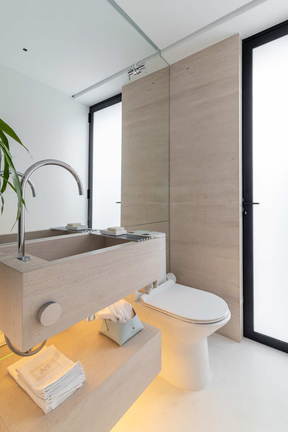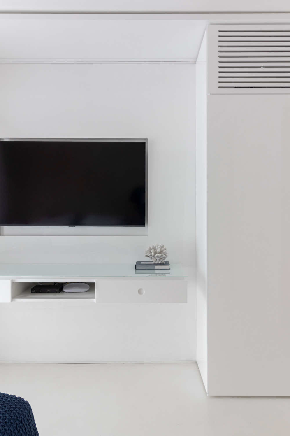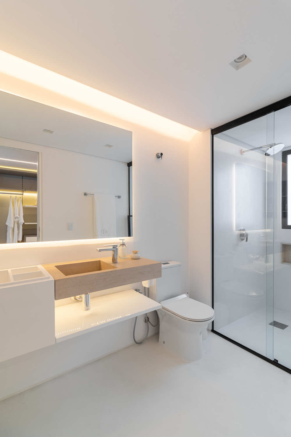 Em apenas 7 meses, o ambiente foi completamente reformado, havendo a troca de esquadrias, elétrica, hidráulica e sistema de gás. Os quatro quartos também se tornaram apenas duas grandes suítes com closet. Foram utilizadas diferentes texturas e tons de branco, além de mobiliário assinado por designers renomados.