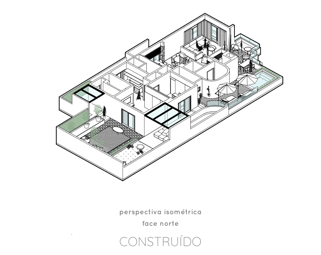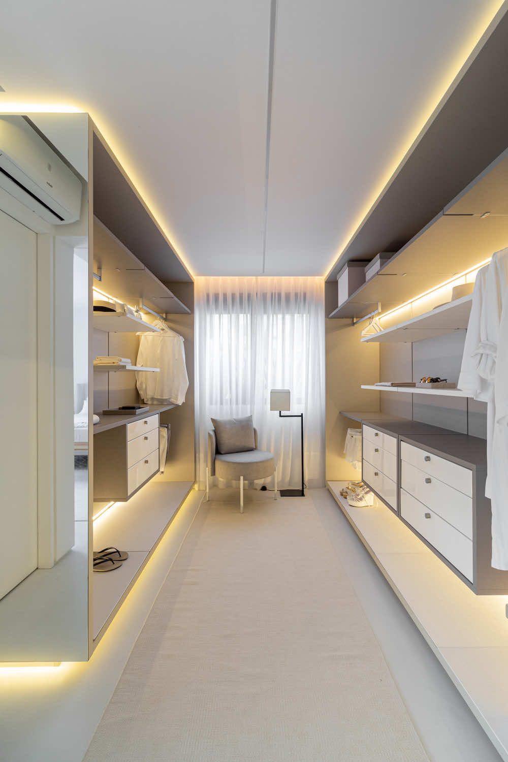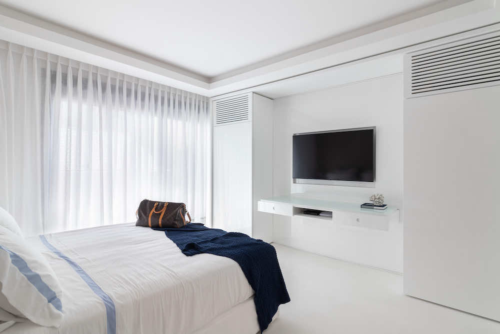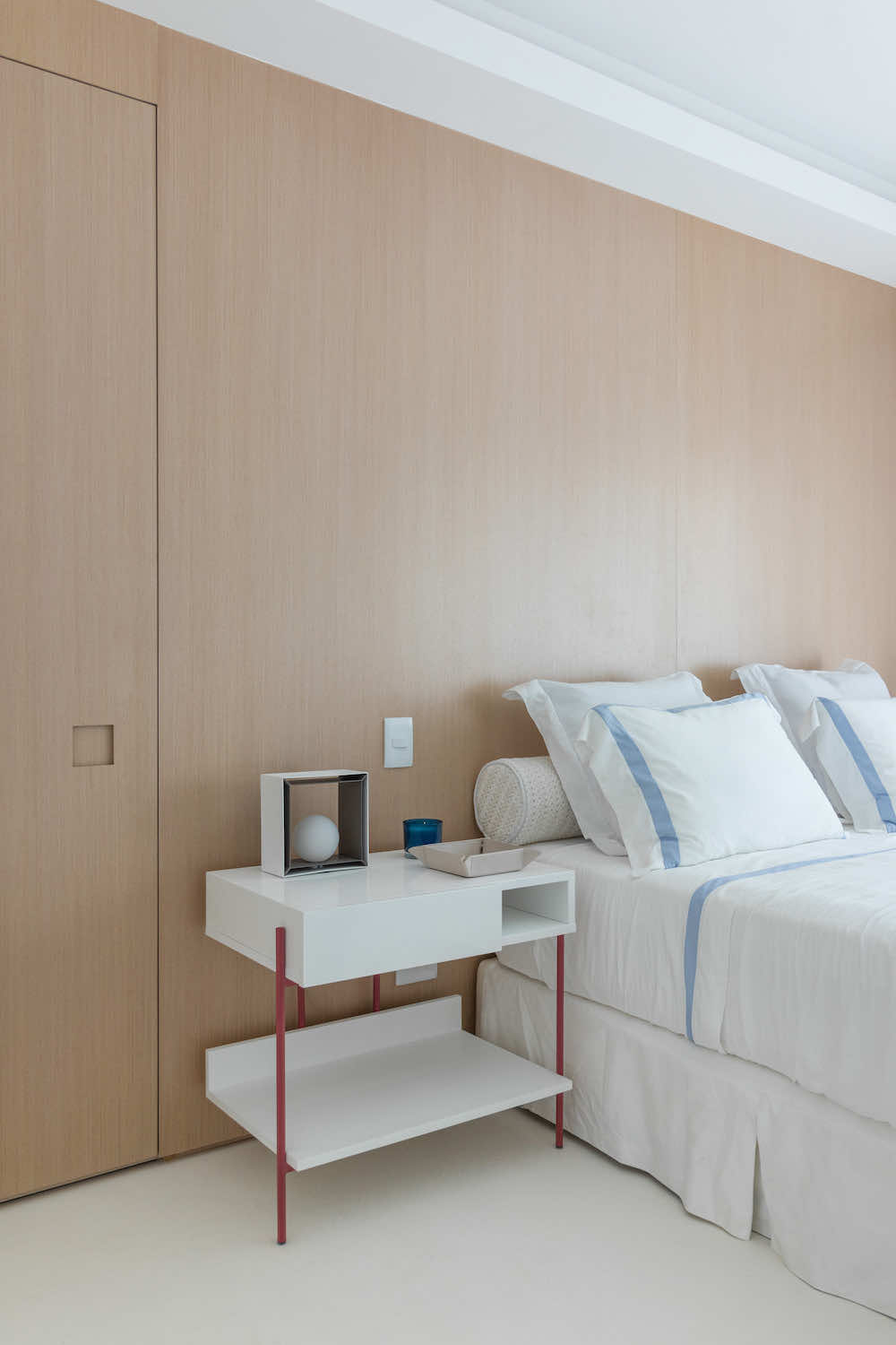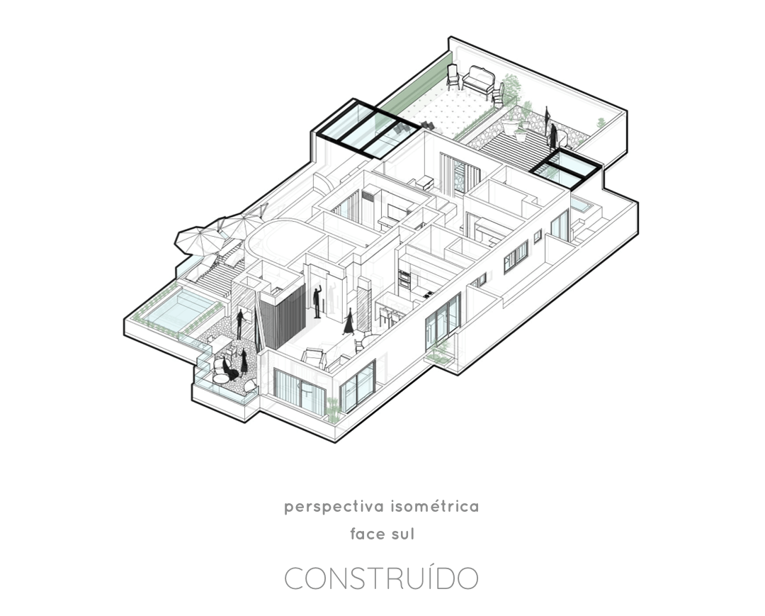 Em apenas 7 meses, o ambiente foi completamente reformado, havendo a troca de esquadrias, elétrica, hidráulica e sistema de gás. Os quatro quartos também se tornaram apenas duas grandes suítes com closet. Foram utilizadas diferentes texturas e tons de branco, além de mobiliário assinado por designers renomados.