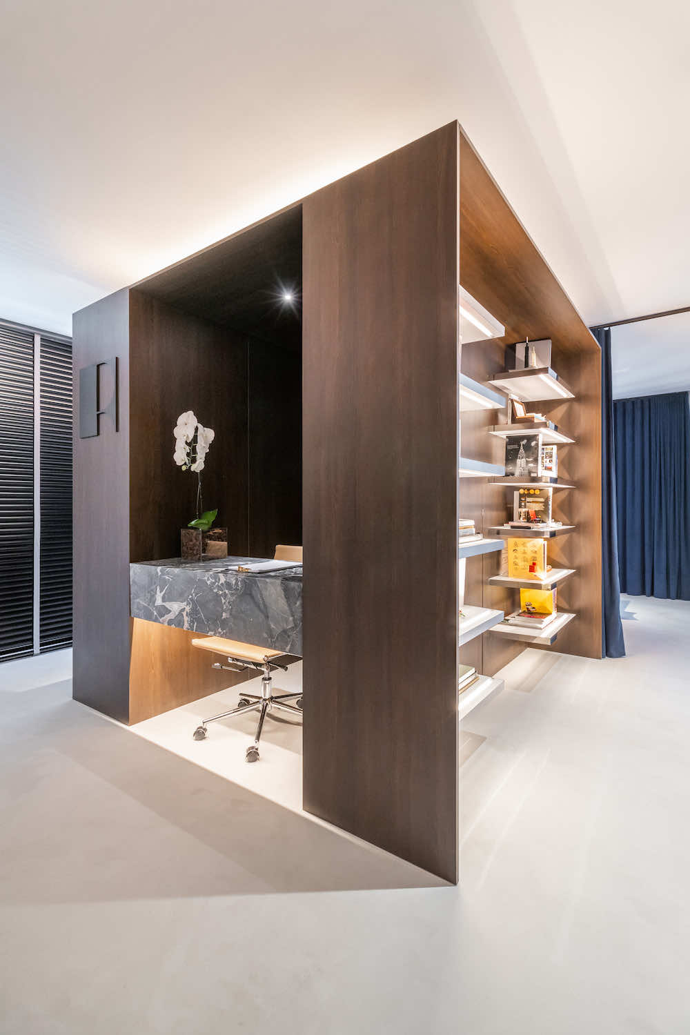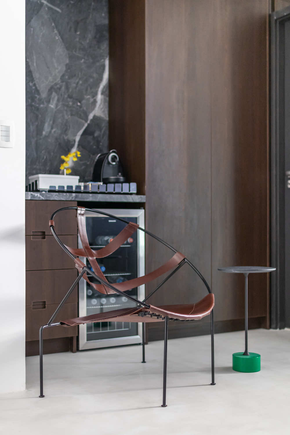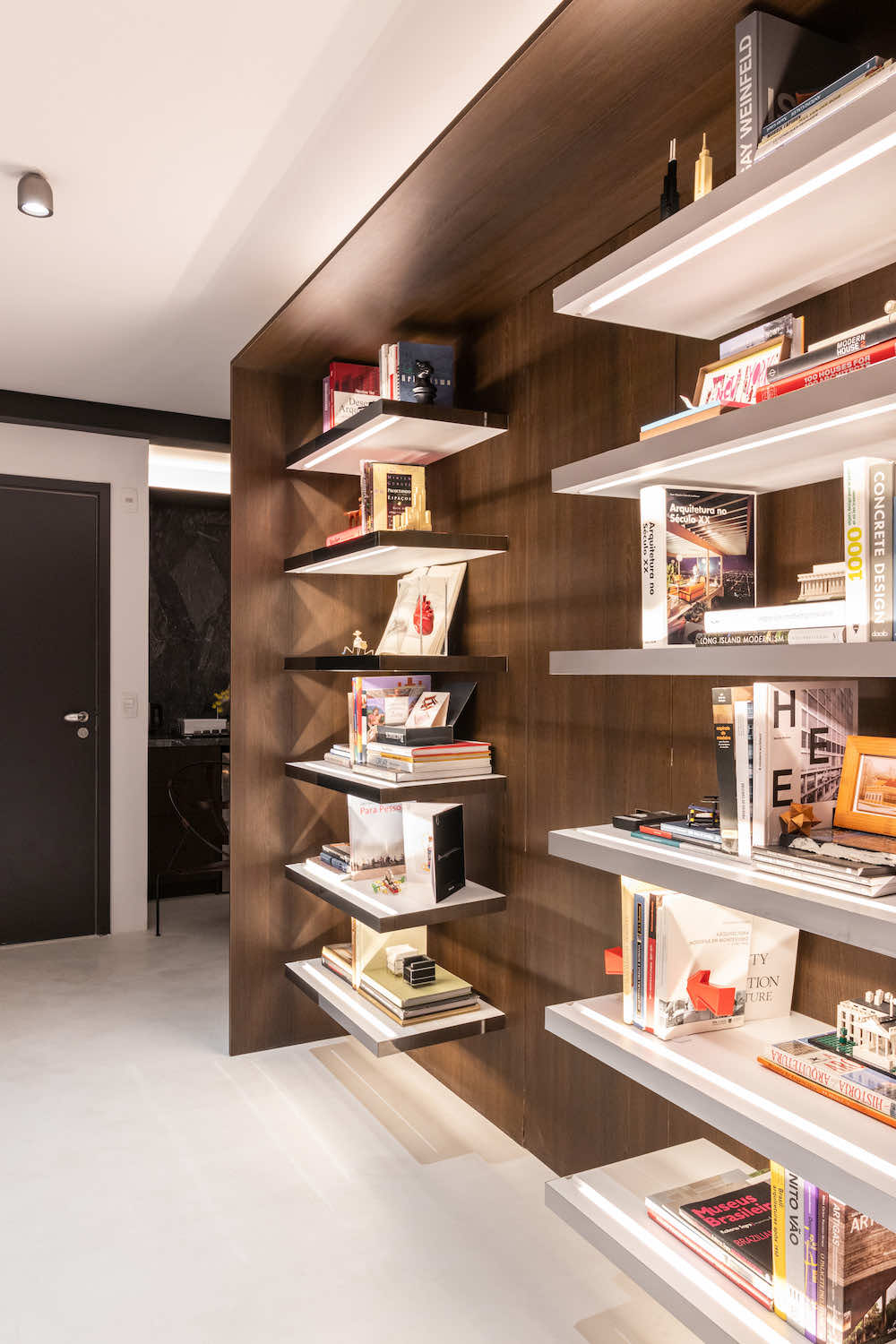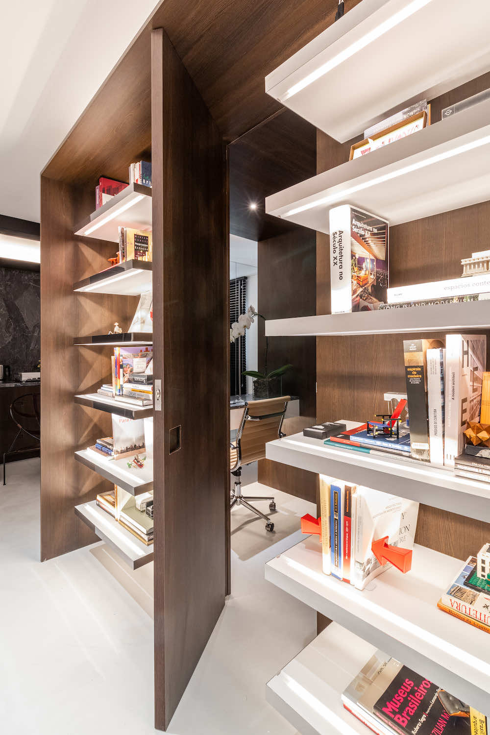 O escritório do arquiteto Rodolfo Fontana. A ideia é deixar à vista uma amostra do que podemos levar aos clientes: Este know-how de elementos tradicionais com uma arquitetura contemporânea e minimalista.