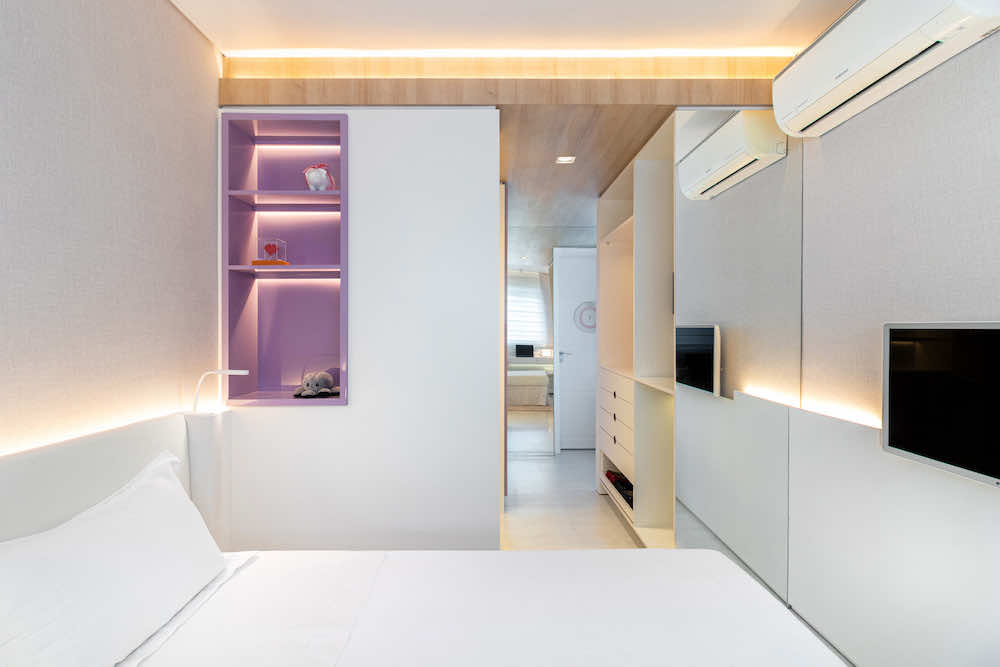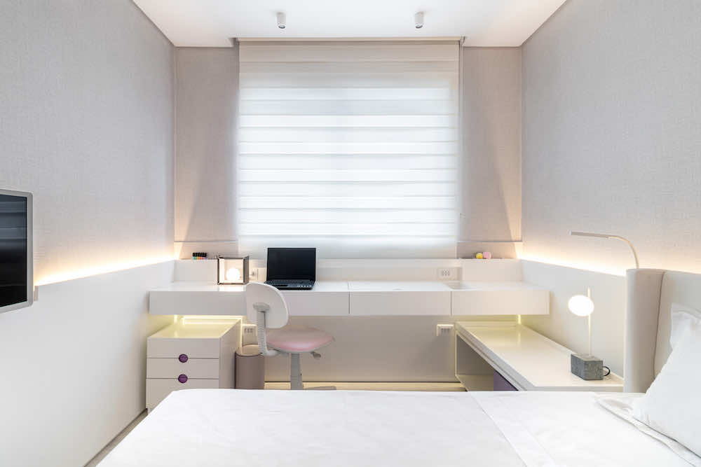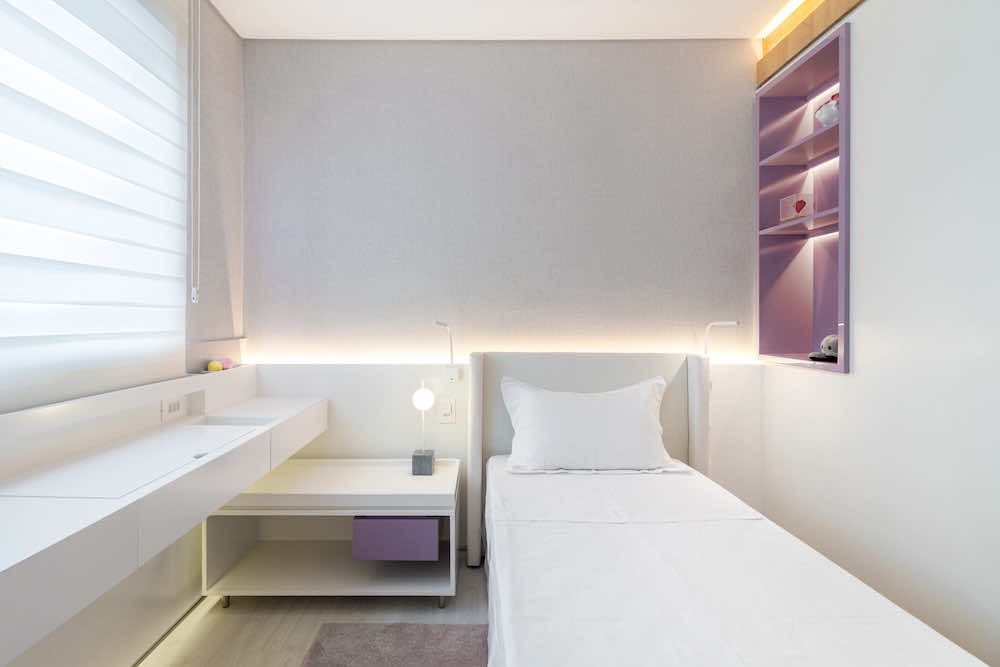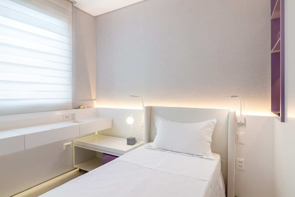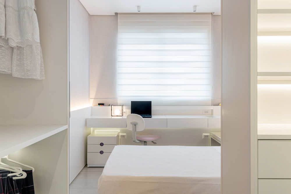 O quarto de uma menina de 10 anos foi redesenhado para que pudesse usá-lo até a sua fase adulta. O maior desafio foi otimizar o espaço restrito e setorizar em nichos de closet, descanso, estudos e maquiagem.