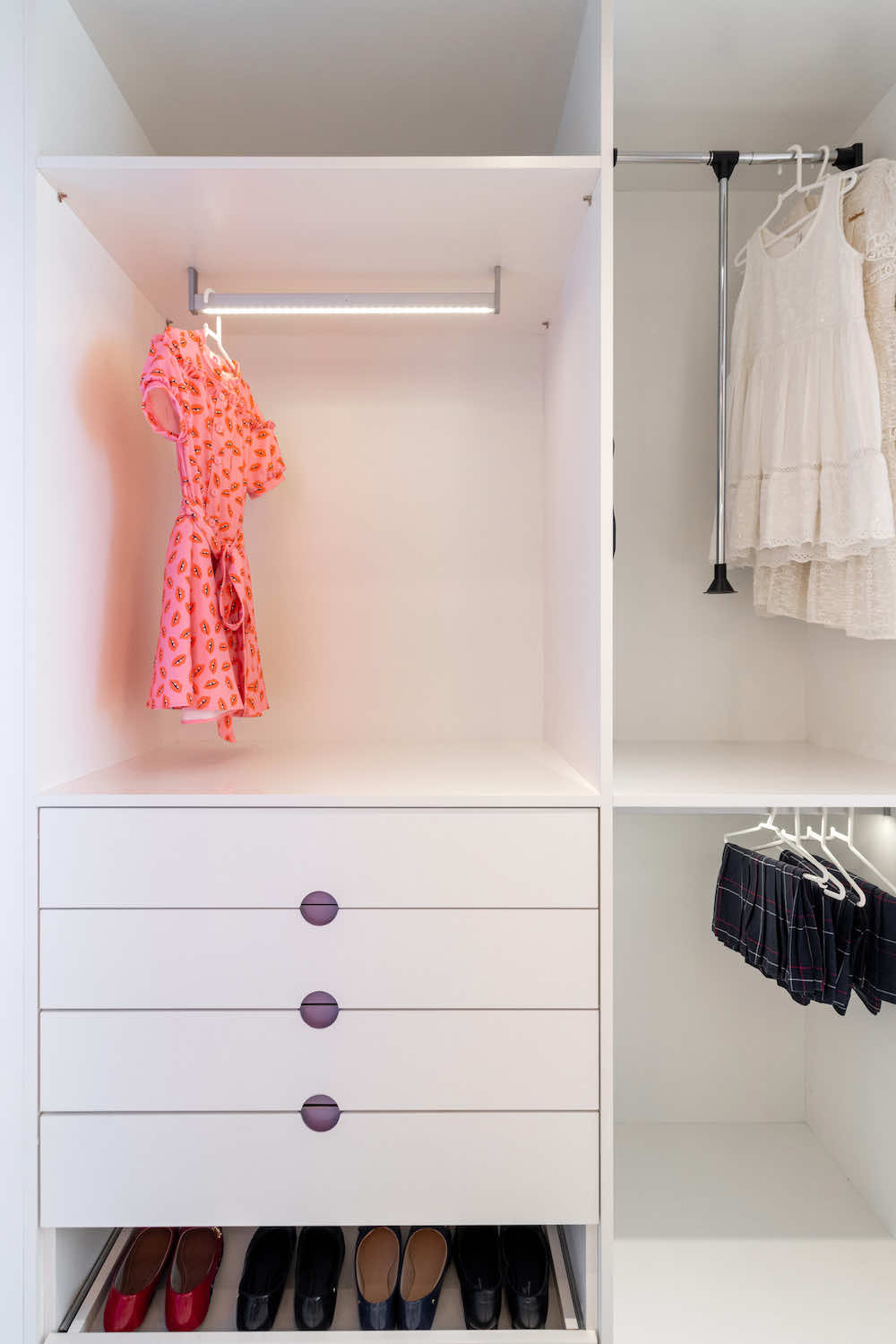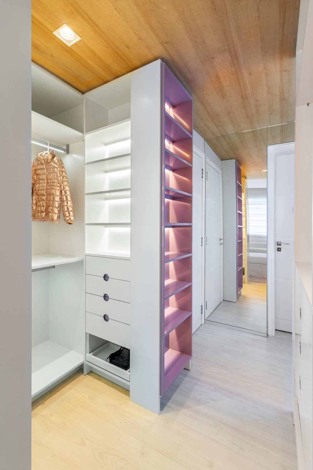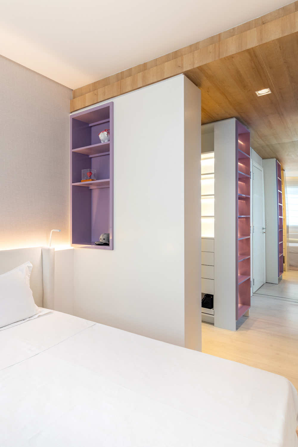 O quarto de uma menina de 10 anos foi redesenhado para que pudesse usá-lo até a sua fase adulta. O maior desafio foi otimizar o espaço restrito e setorizar em nichos de closet, descanso, estudos e maquiagem.