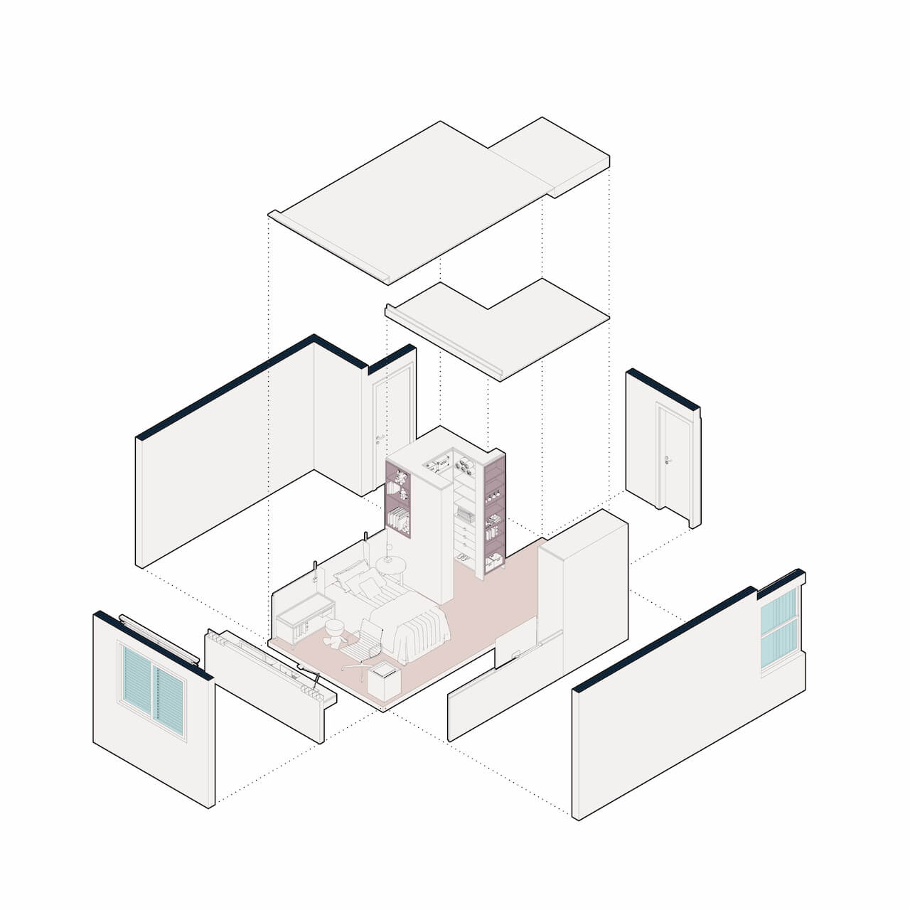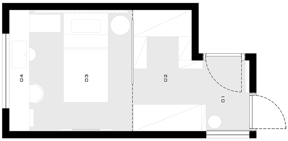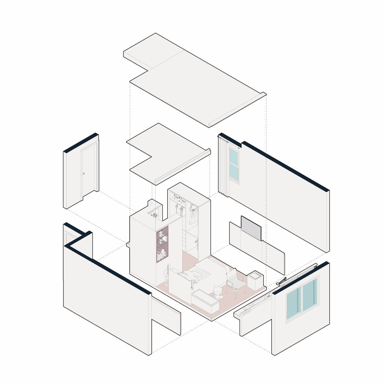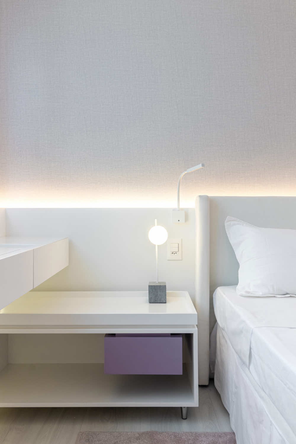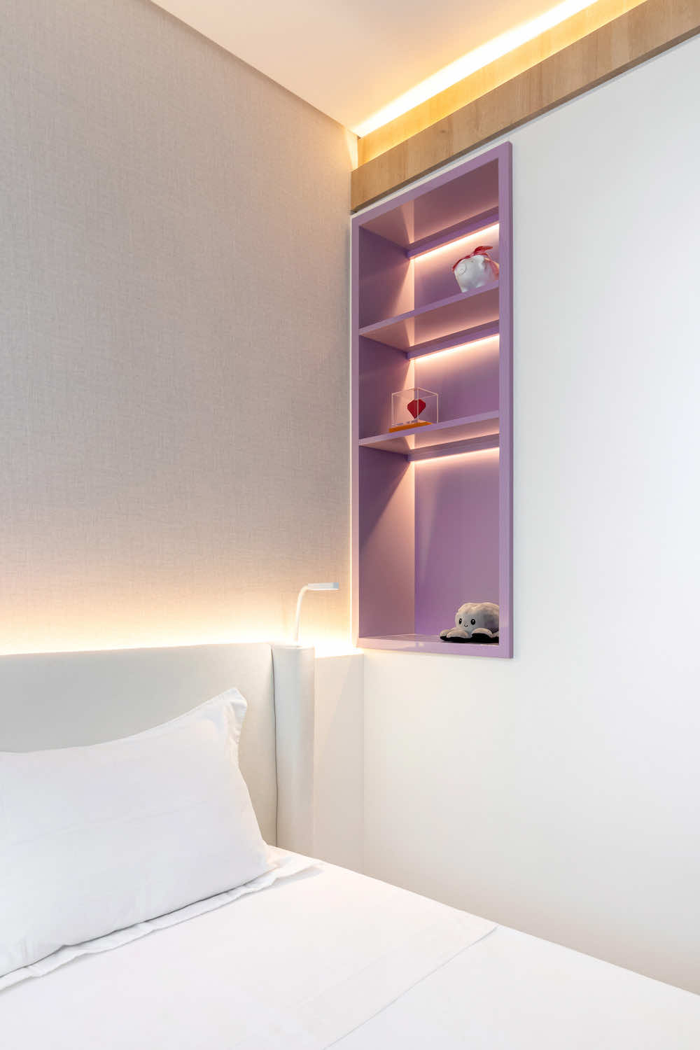 No ambiente para dormir, foram selecionadas tonalidades muito claras, como o off white e cinza claro, além de cores de preferência da própria criança.