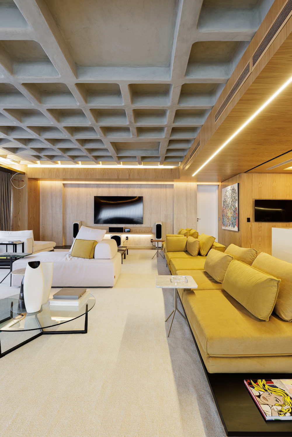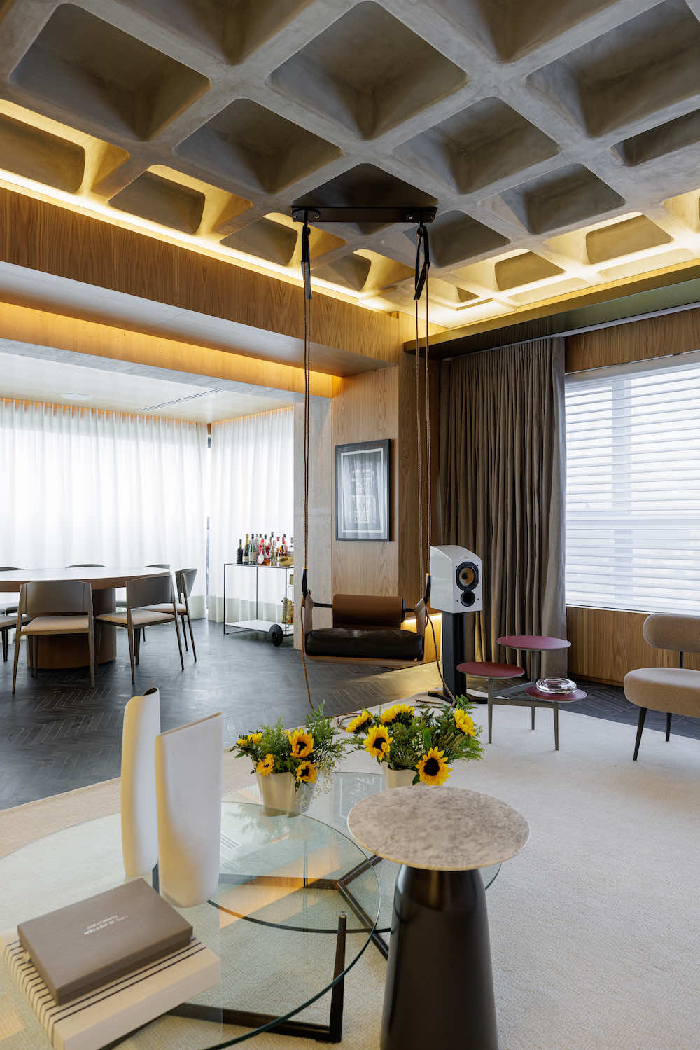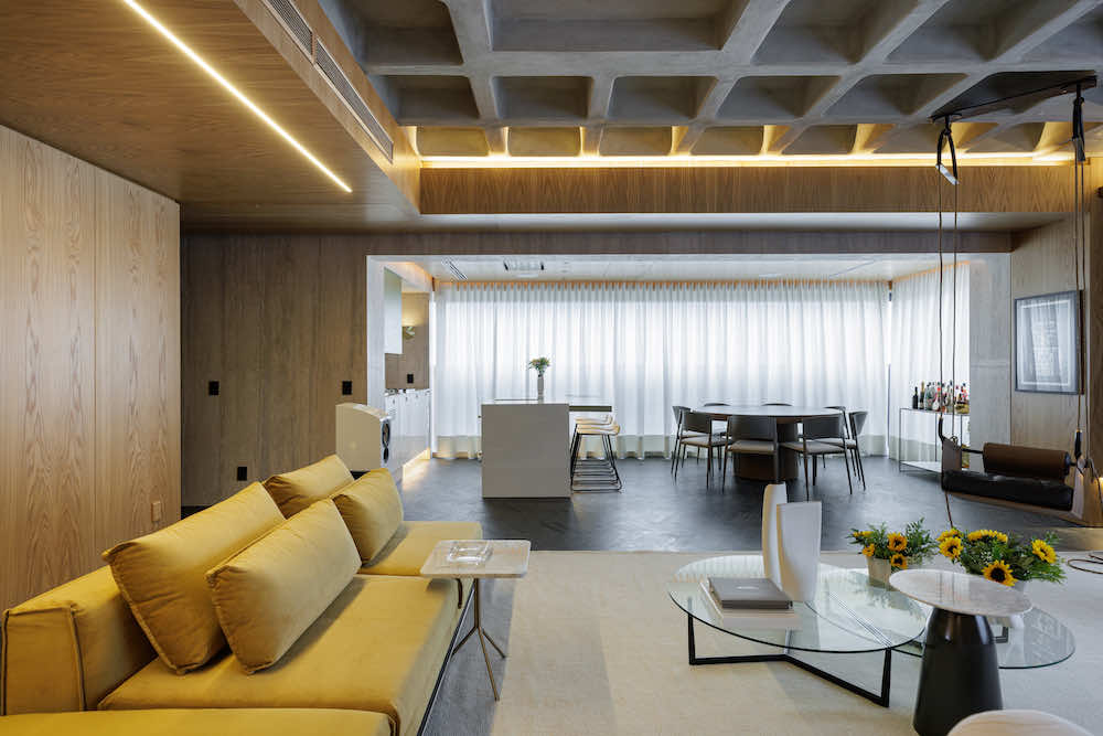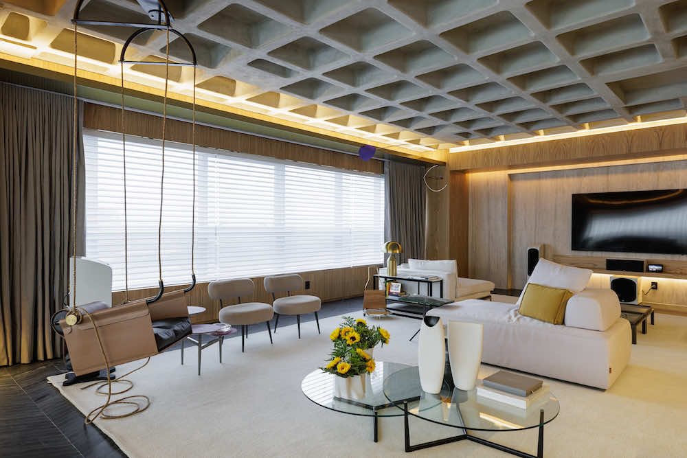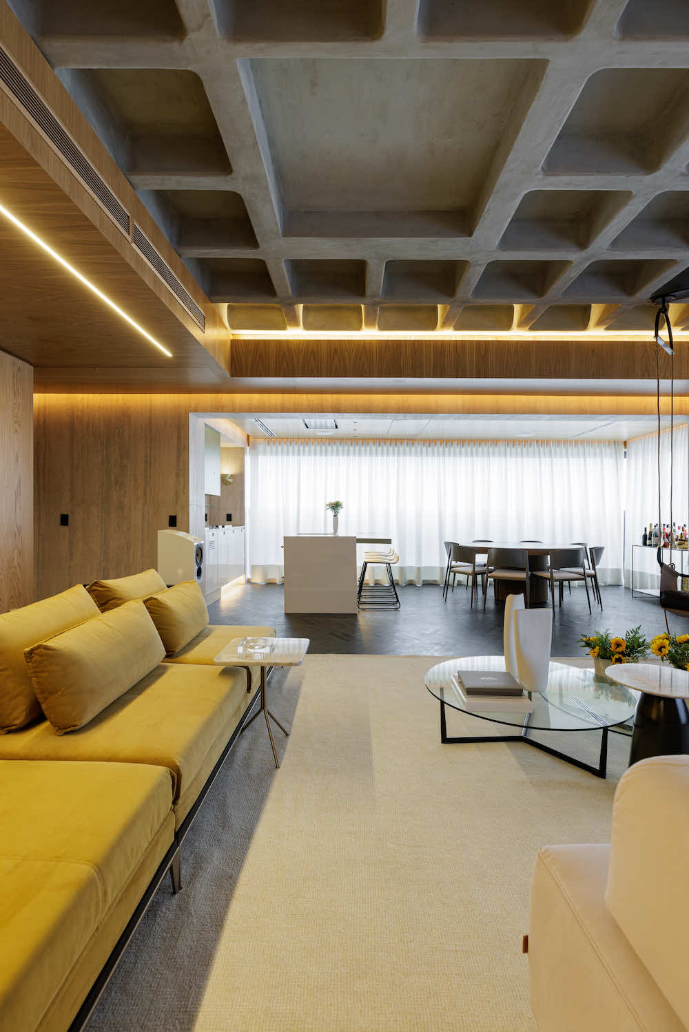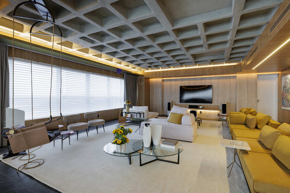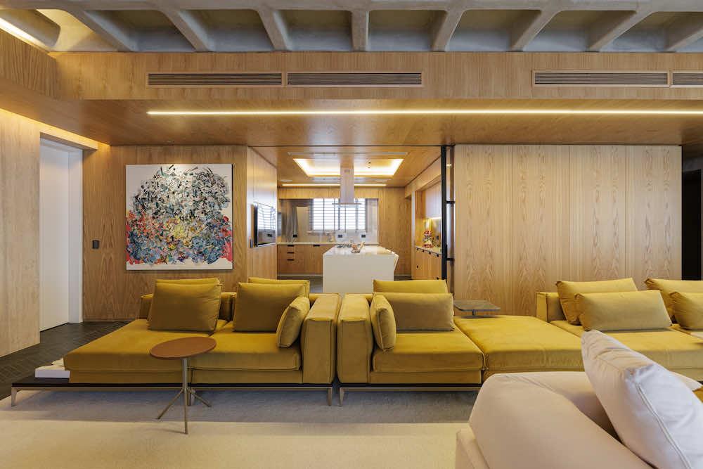 Os quatro quartos se transformaram em 2 grandes suítes e uma academia de ginástica, onde o morador pode praticar yoga e outras atividades de bem-estar. Para dar a percepção de amplitude, foi fechada a varanda e integrados todos os espaços sociais.