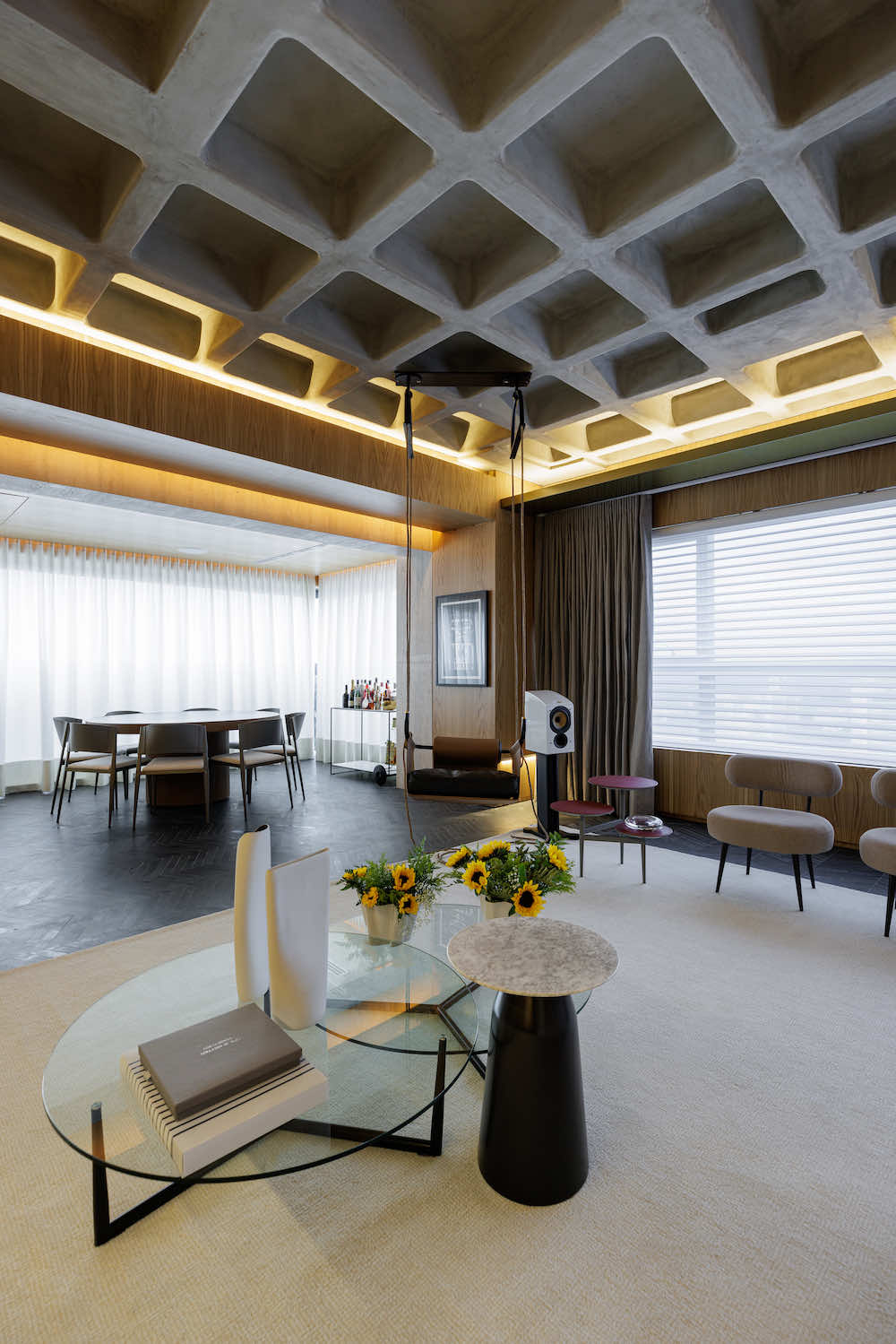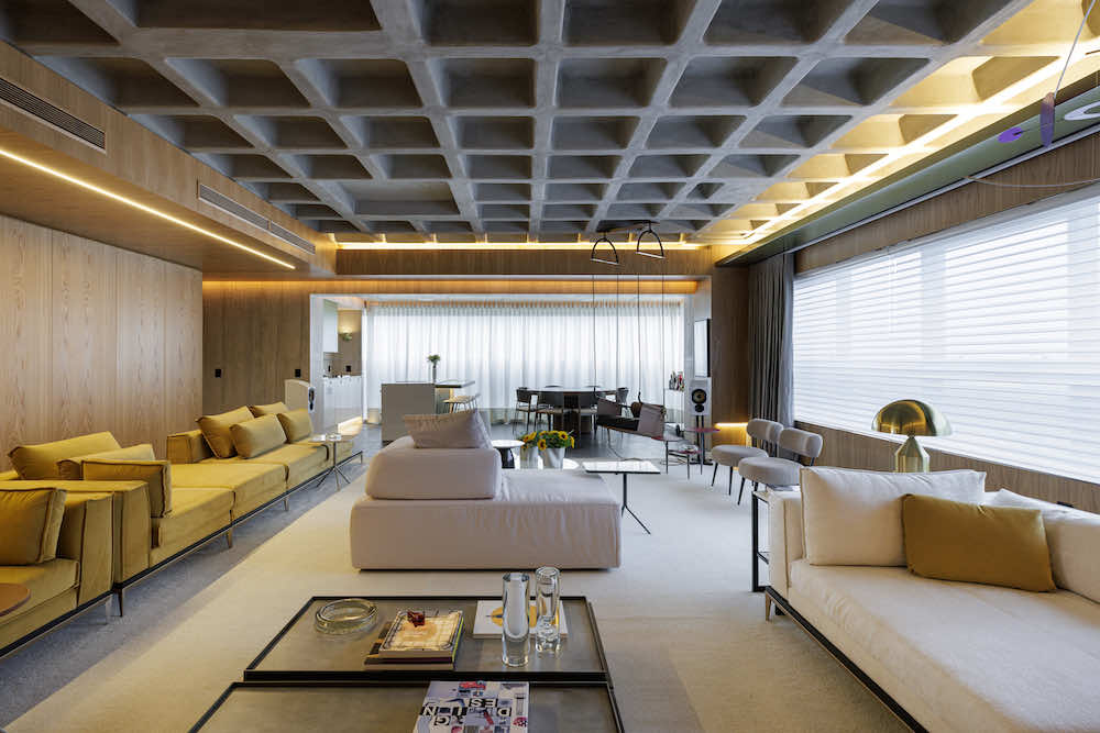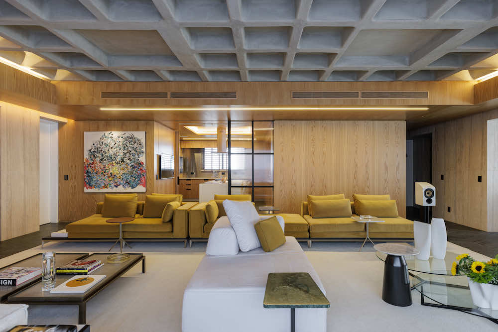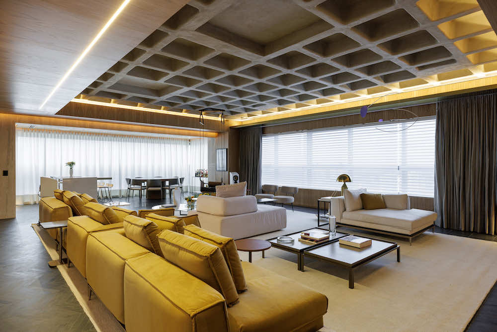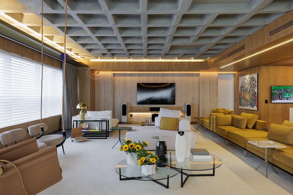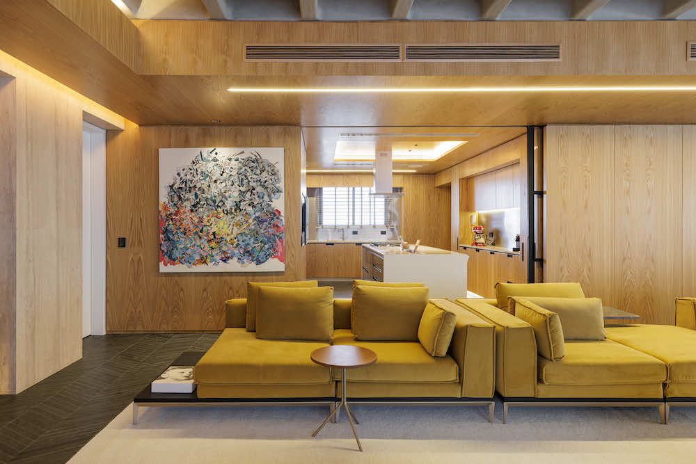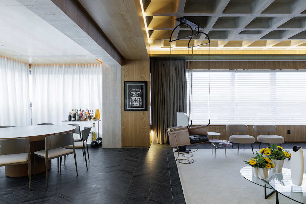 Os quatro quartos se transformaram em 2 grandes suítes e uma academia de ginástica, onde o morador pode praticar yoga e outras atividades de bem-estar. Para dar a percepção de amplitude, foi fechada a varanda e integrados todos os espaços sociais.