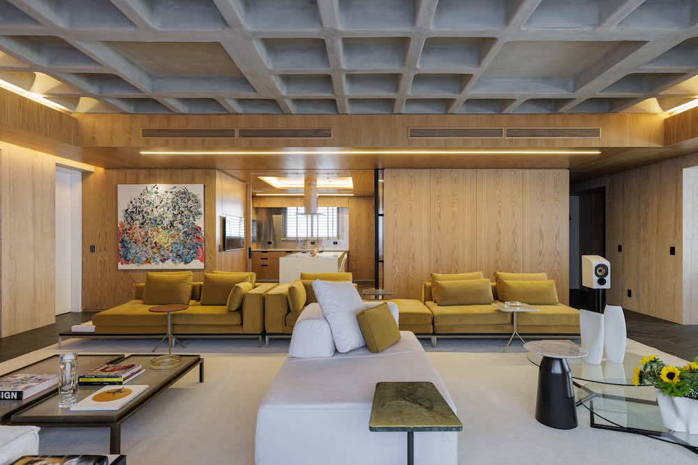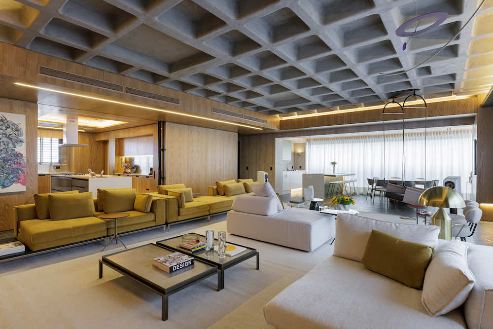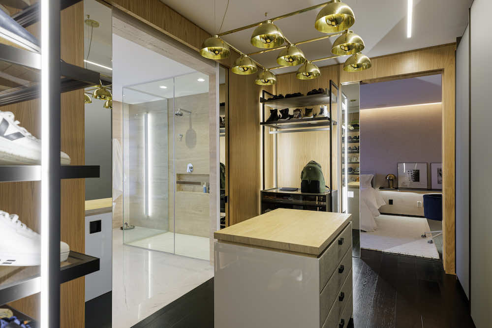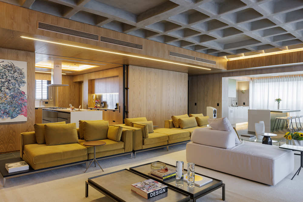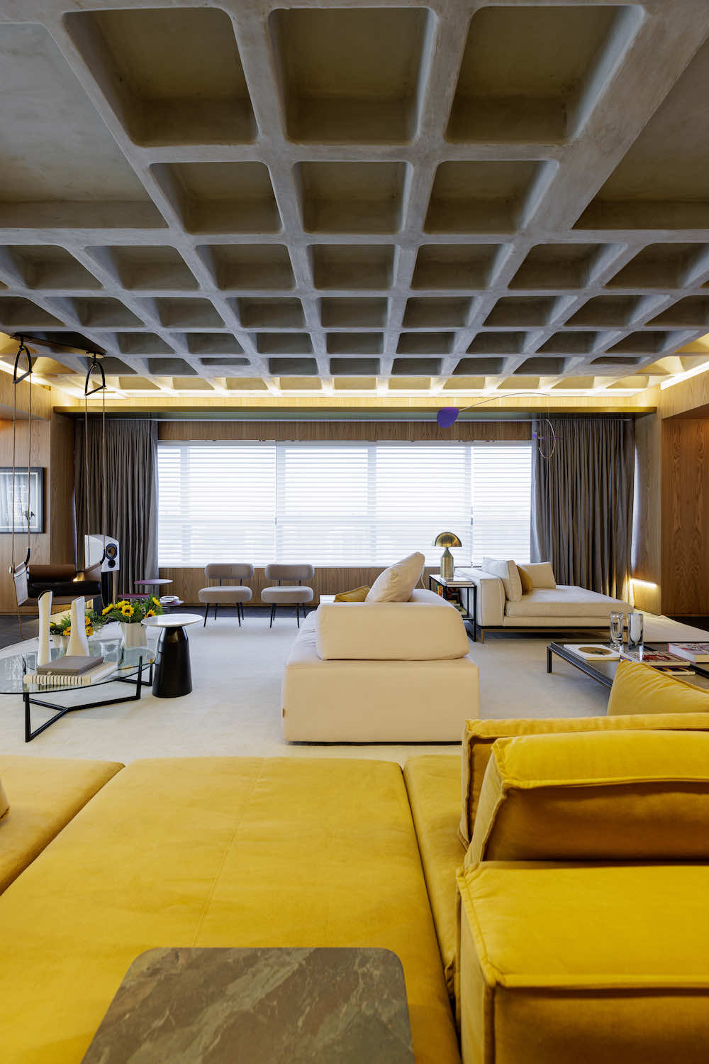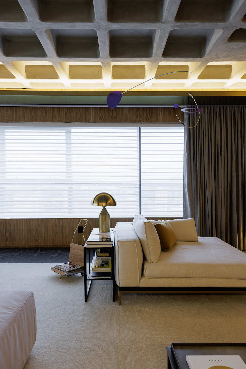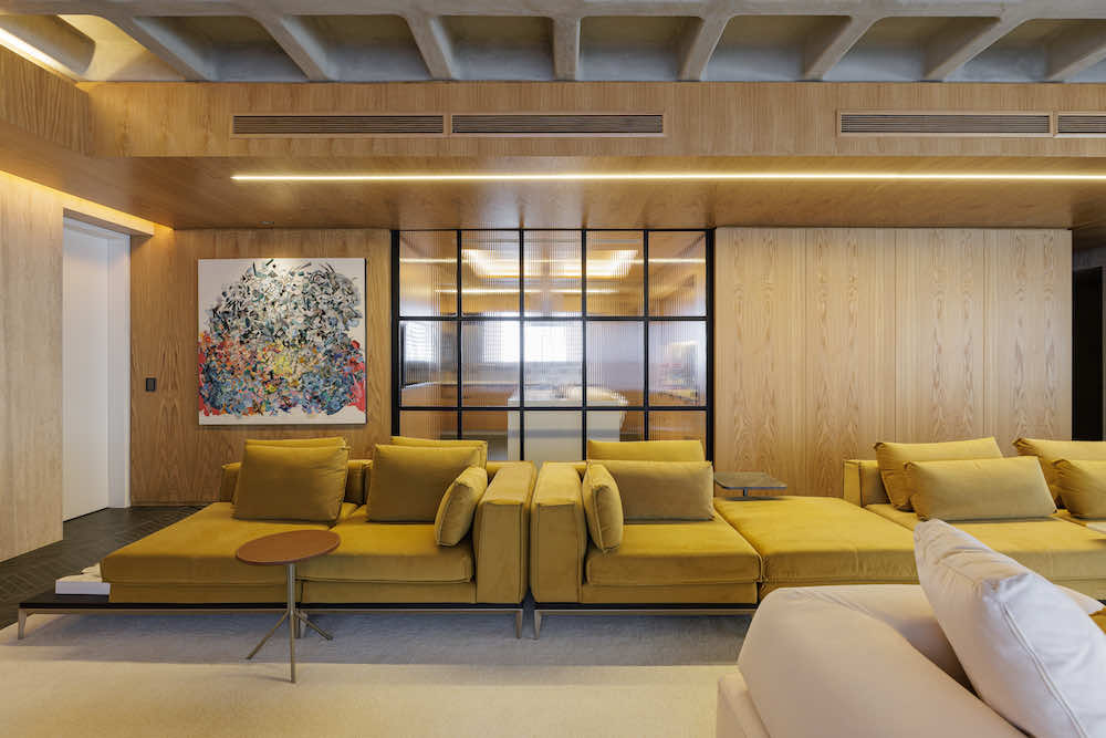 Os quatro quartos se transformaram em 2 grandes suítes e uma academia de ginástica, onde o morador pode praticar yoga e outras atividades de bem-estar. Para dar a percepção de amplitude, foi fechada a varanda e integrados todos os espaços sociais.