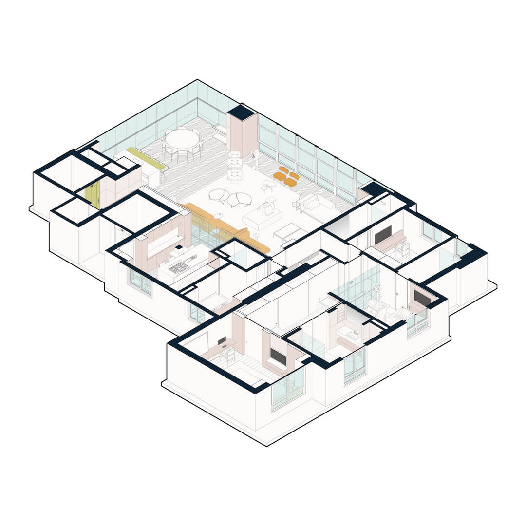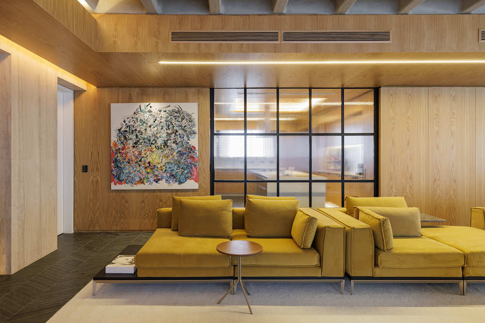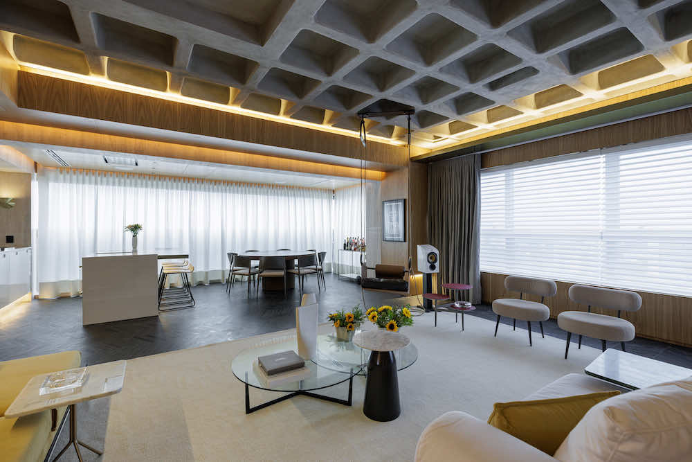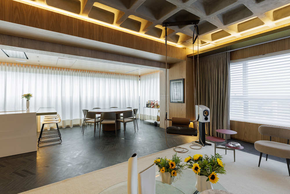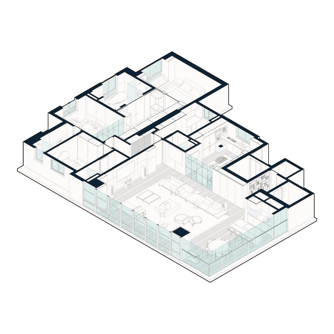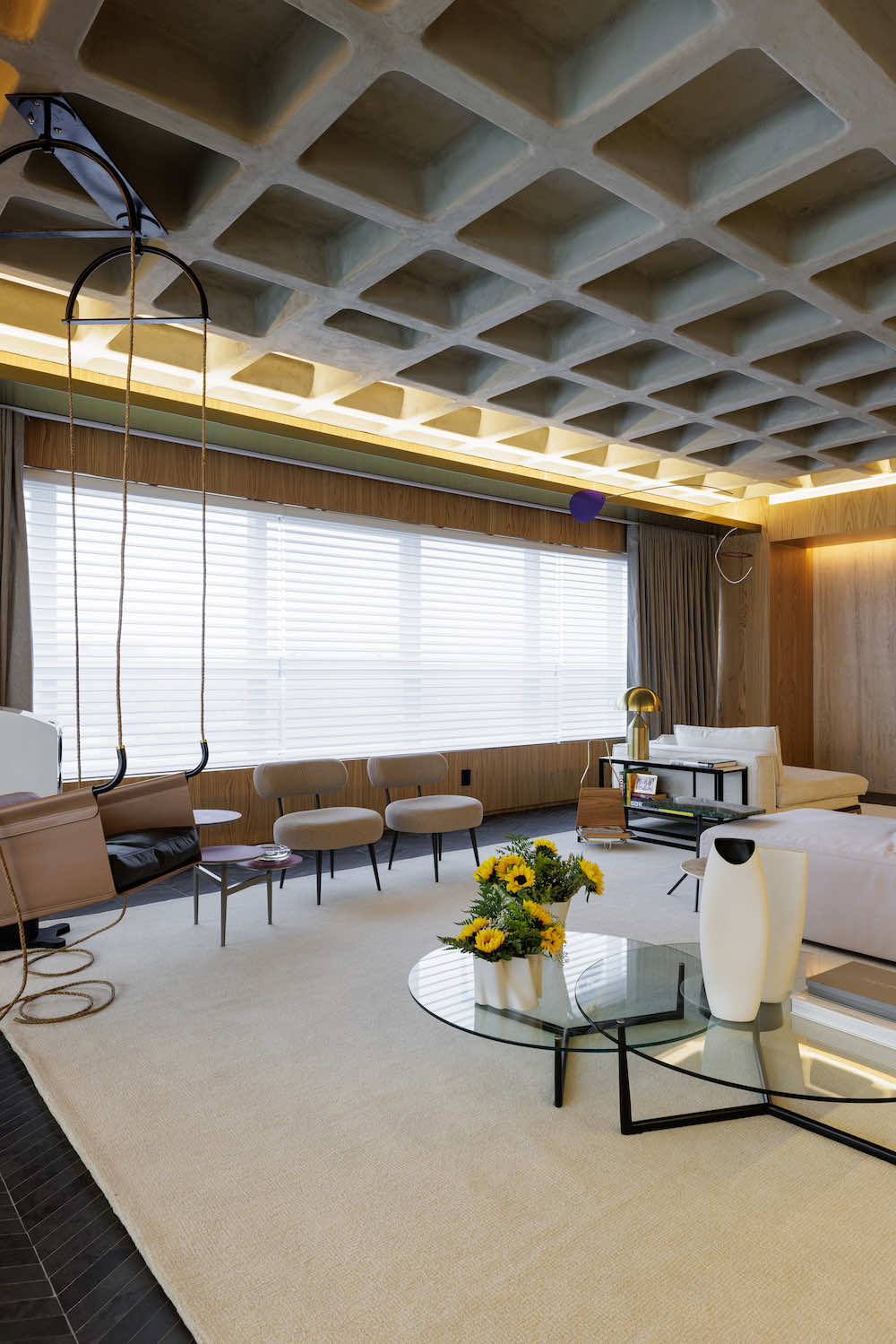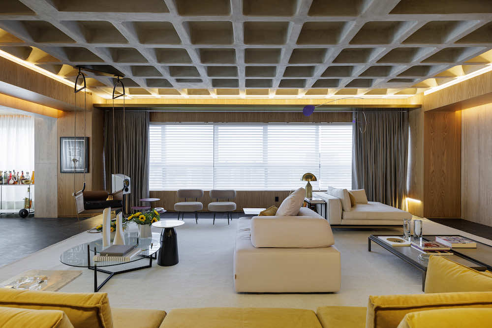 Os quatro quartos se transformaram em 2 grandes suítes e uma academia de ginástica, onde o morador pode praticar yoga e outras atividades de bem-estar. Para dar a percepção de amplitude, foi fechada a varanda e integrados todos os espaços sociais.