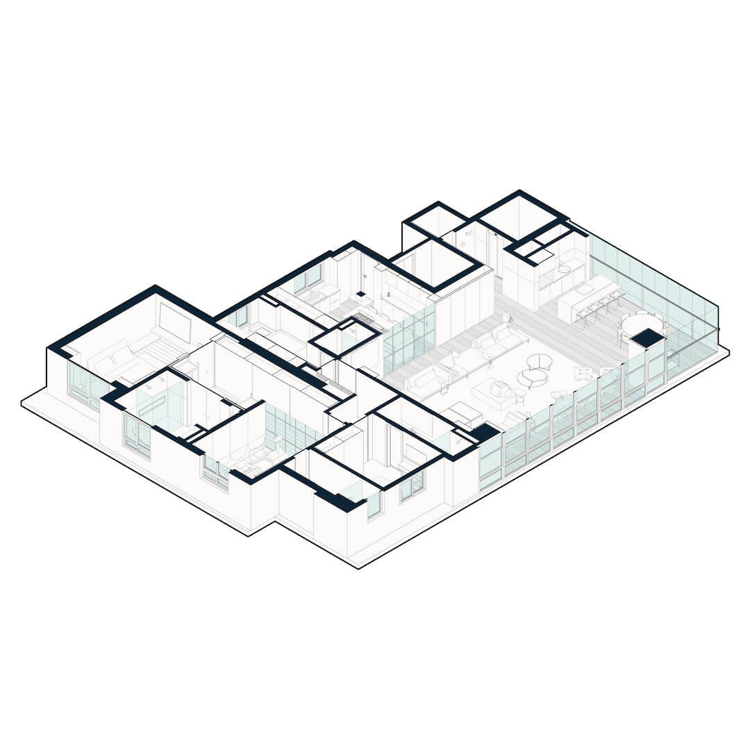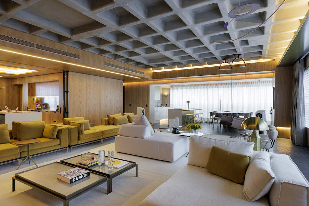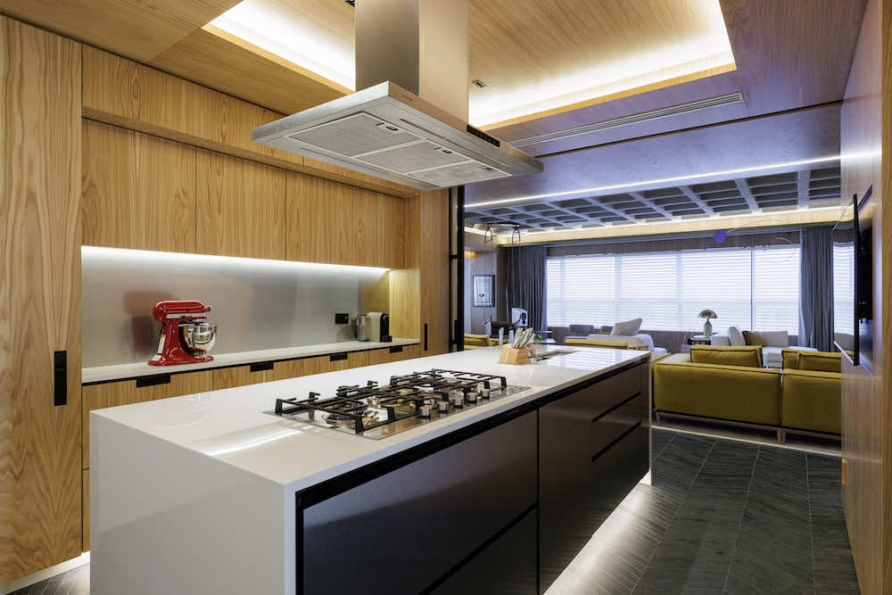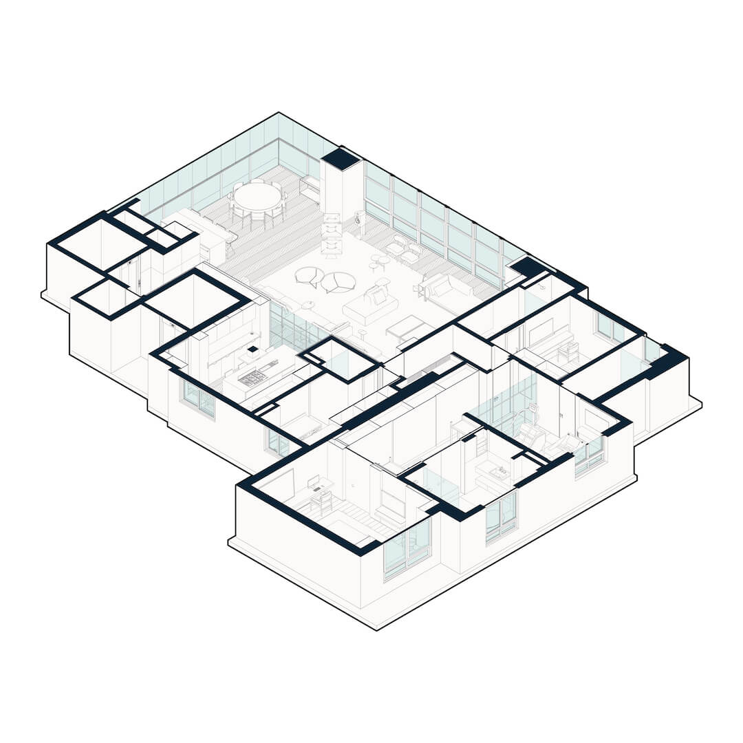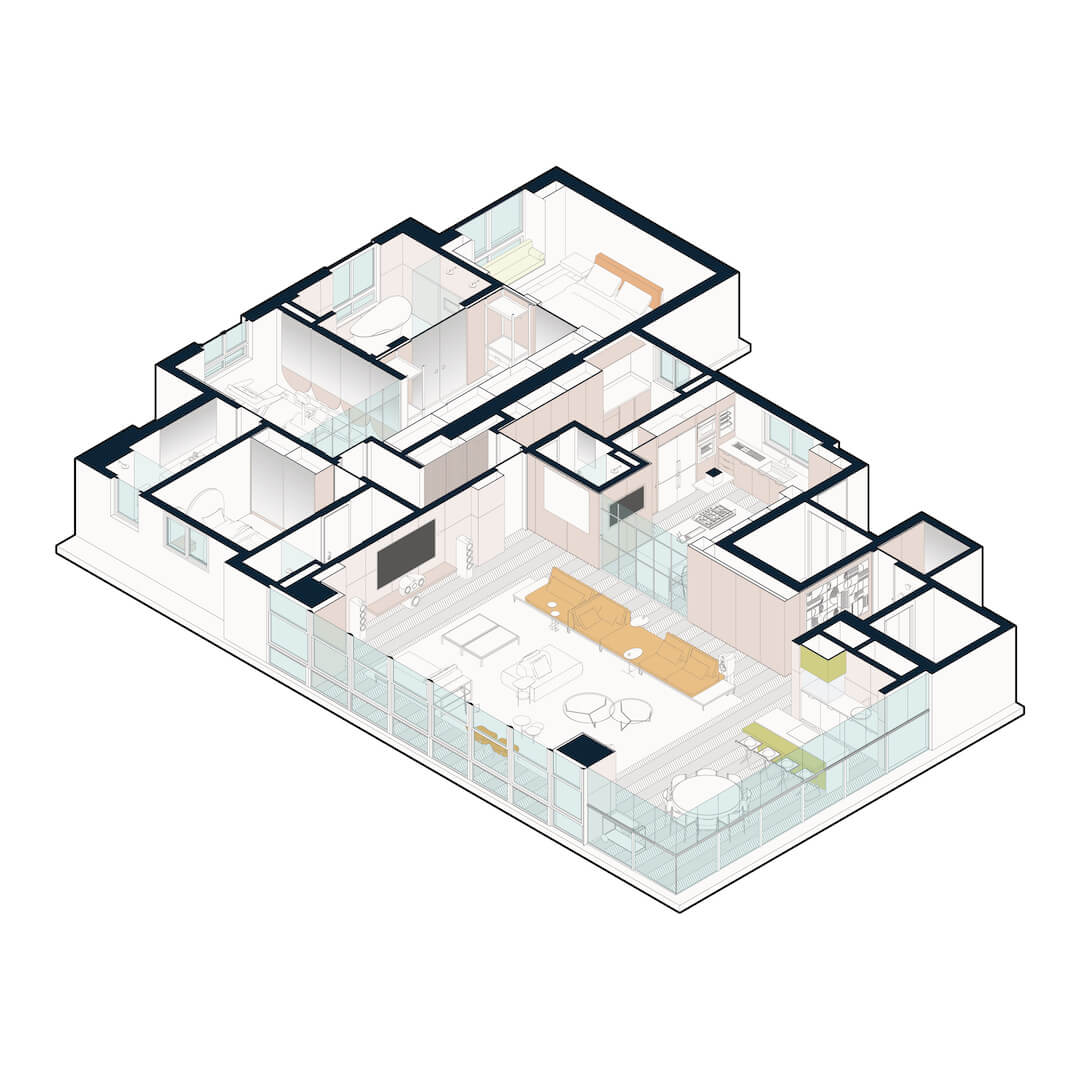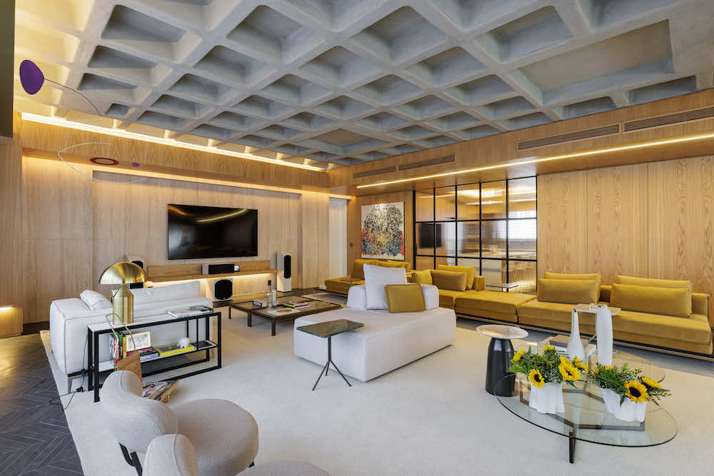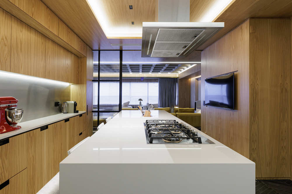 Os quatro quartos se transformaram em 2 grandes suítes e uma academia de ginástica, onde o morador pode praticar yoga e outras atividades de bem-estar. Para dar a percepção de amplitude, foi fechada a varanda e integrados todos os espaços sociais.