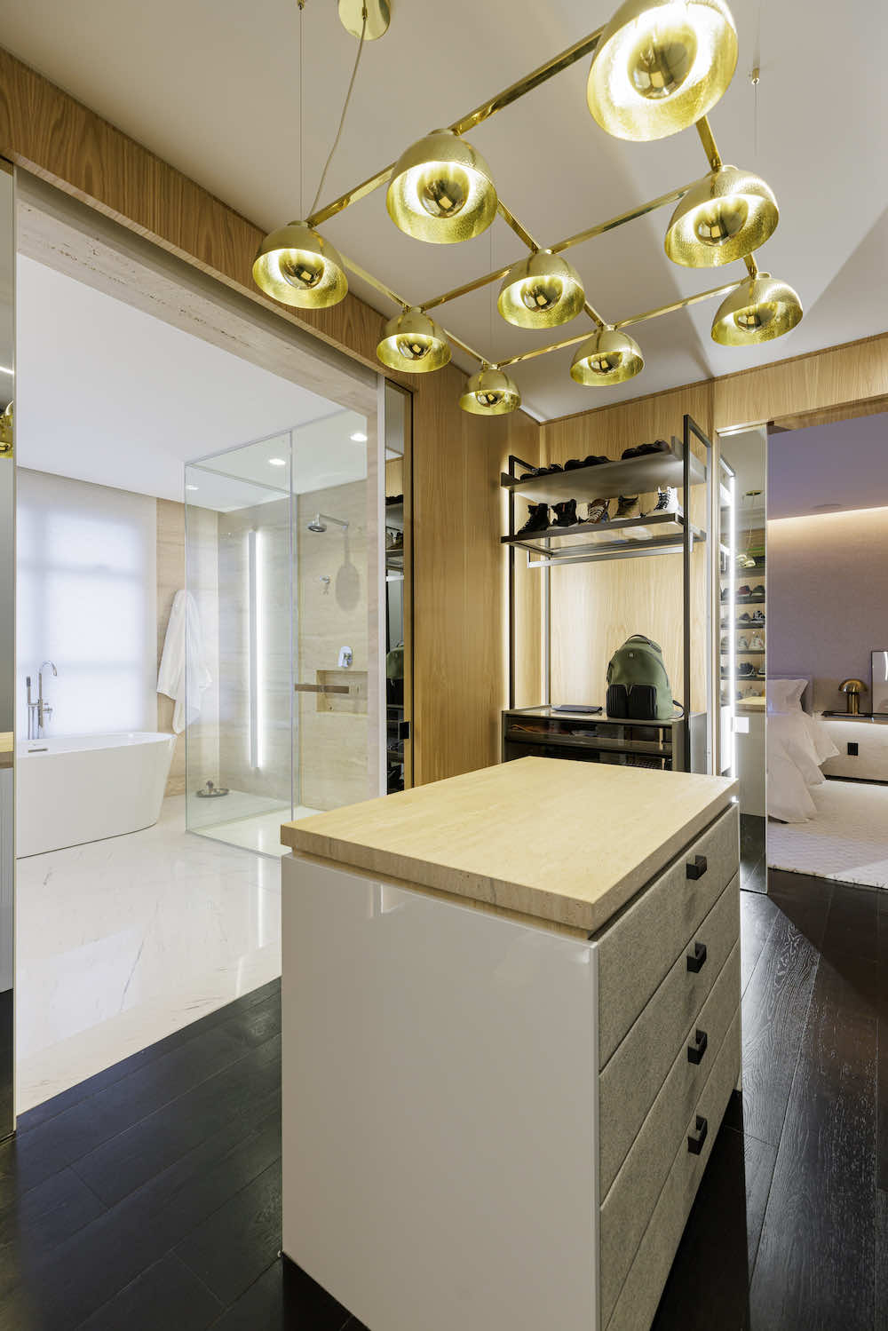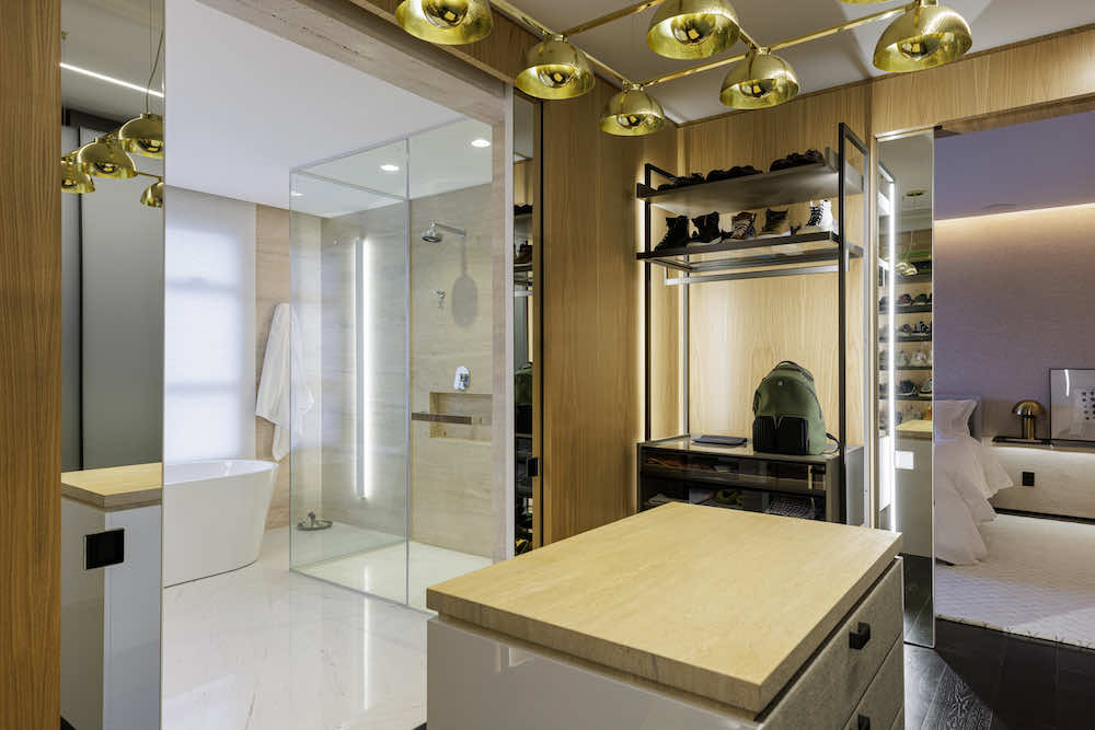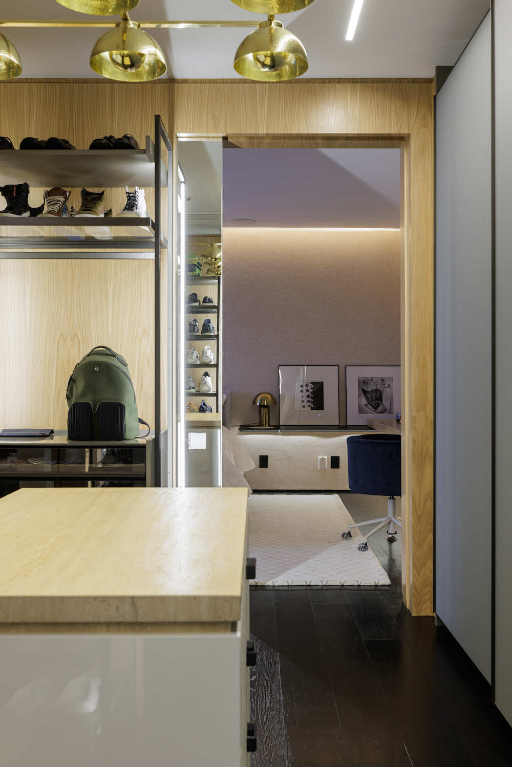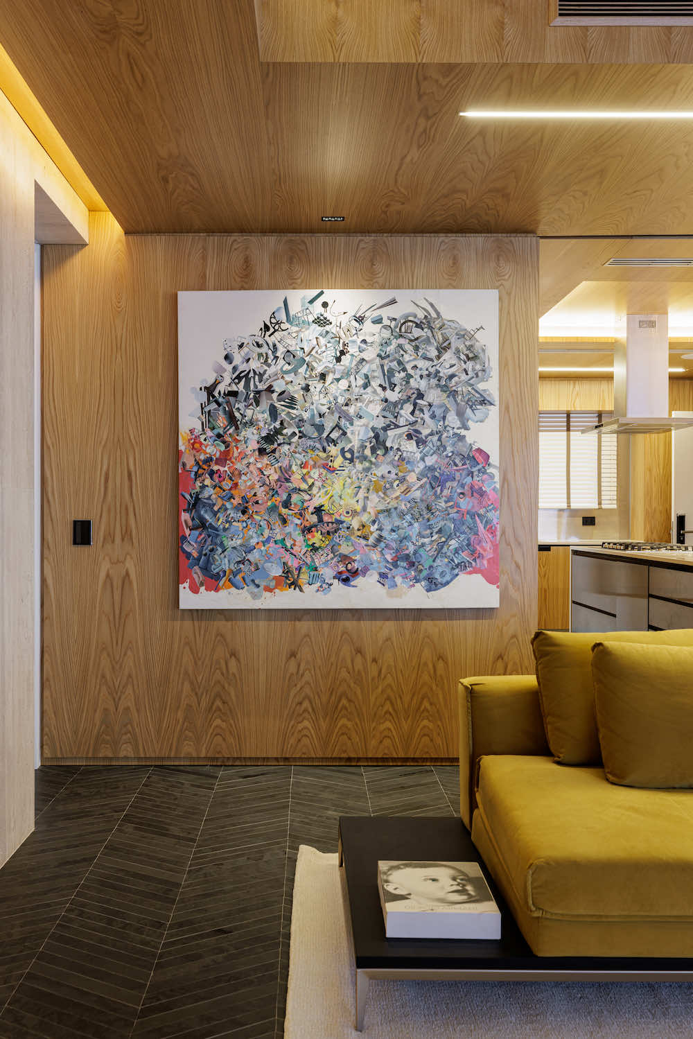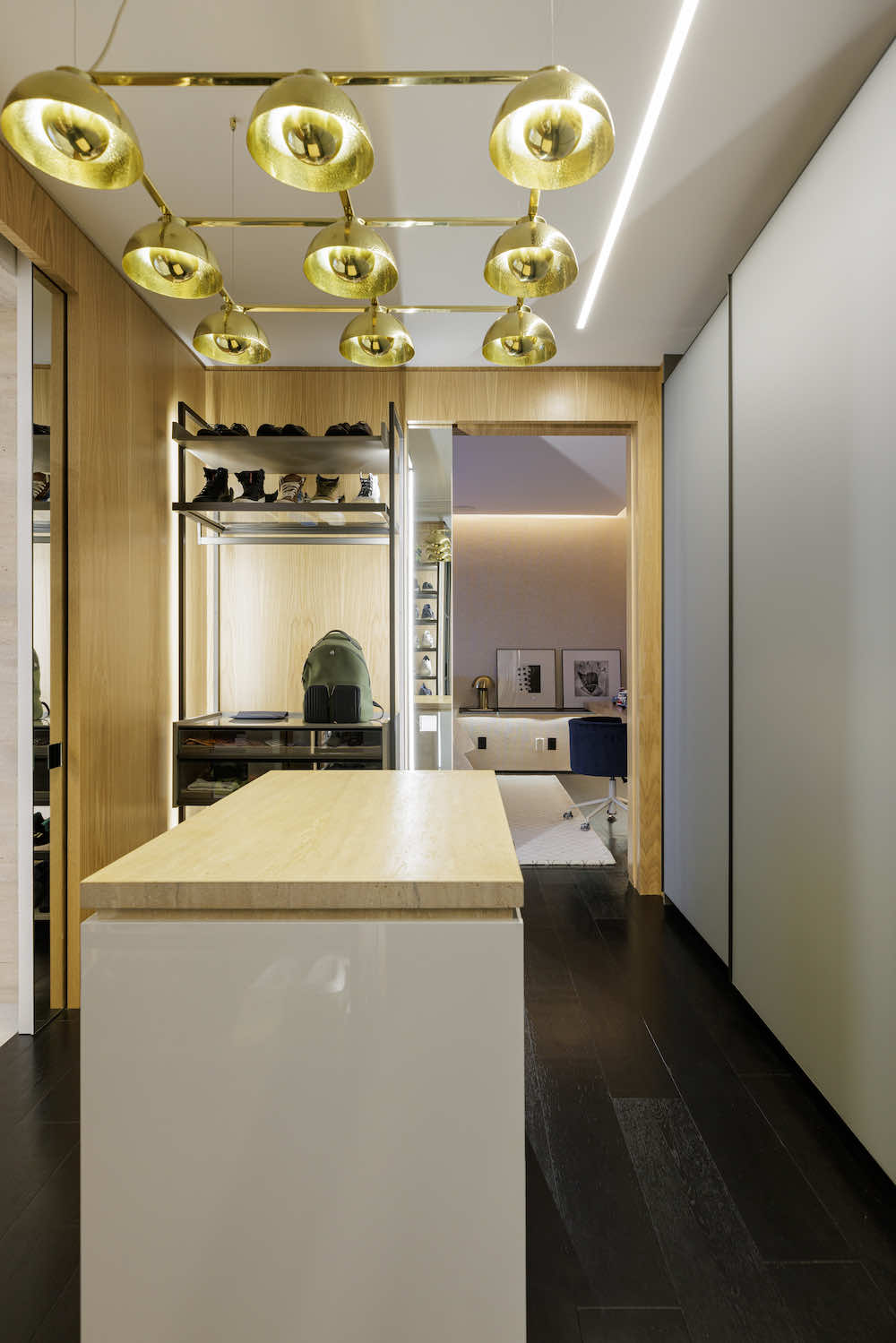 Um apartamento de personalidade. De tons sóbrios, o lugar foi revestido com lâminas de carvalho natural e travertino romano bruto, que é um mármore clássico e atemporal. Também foram usados elementos metálicos variados entre inox escovado, latão escovado e eletrostático preto.
