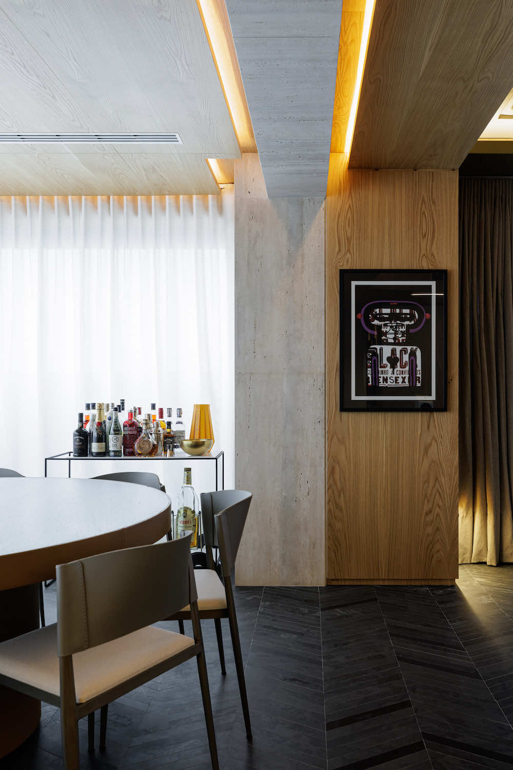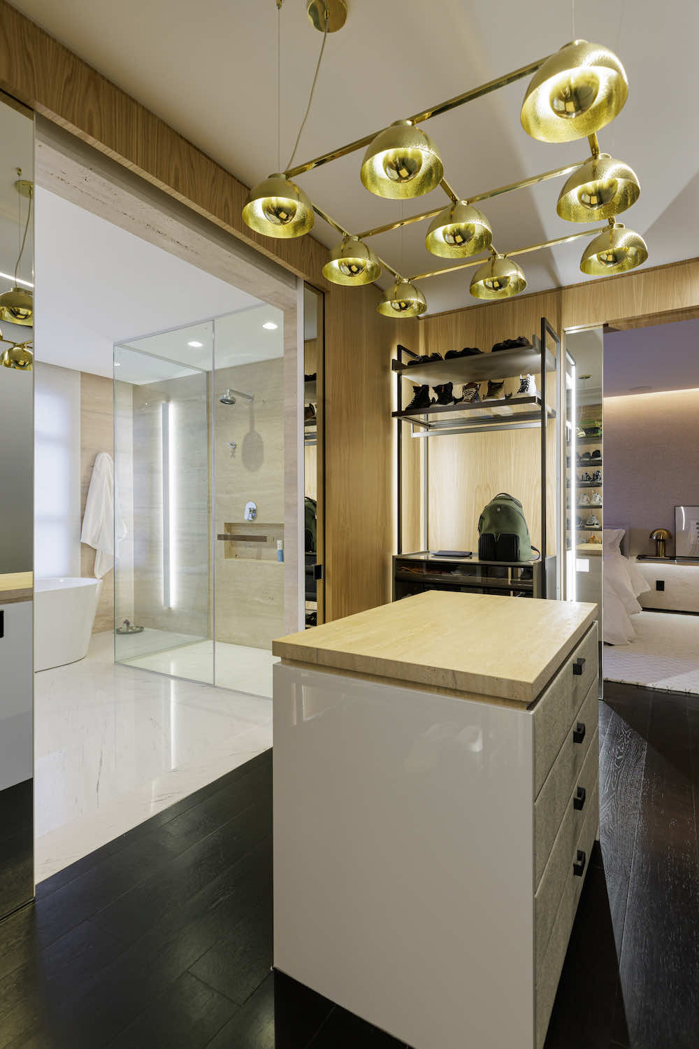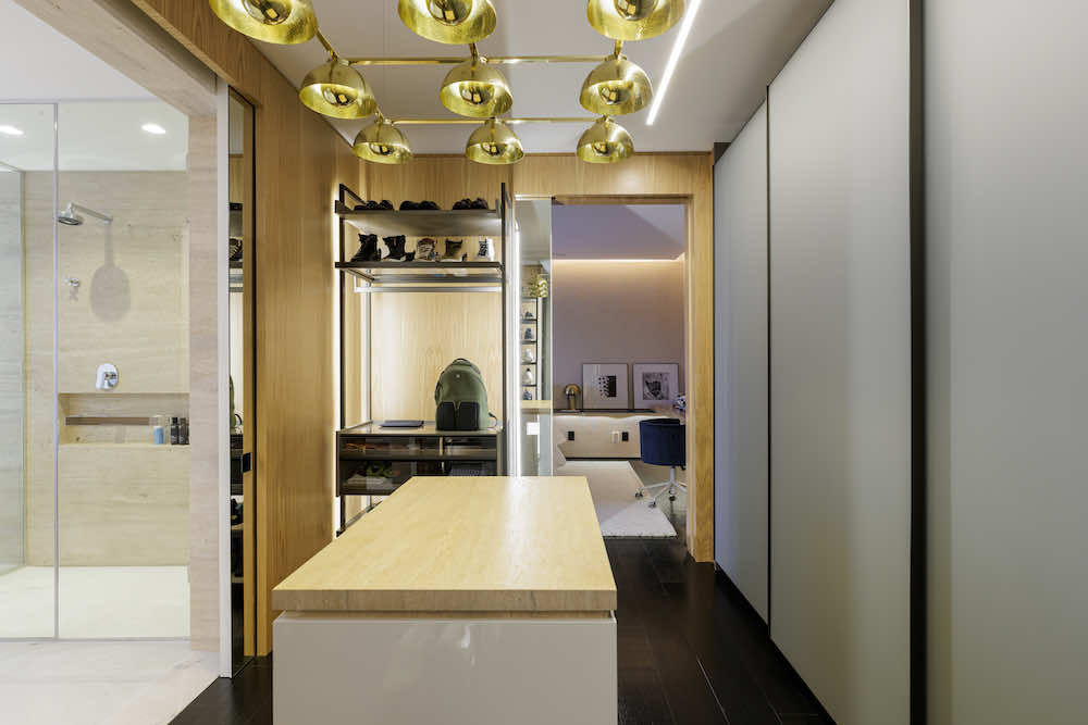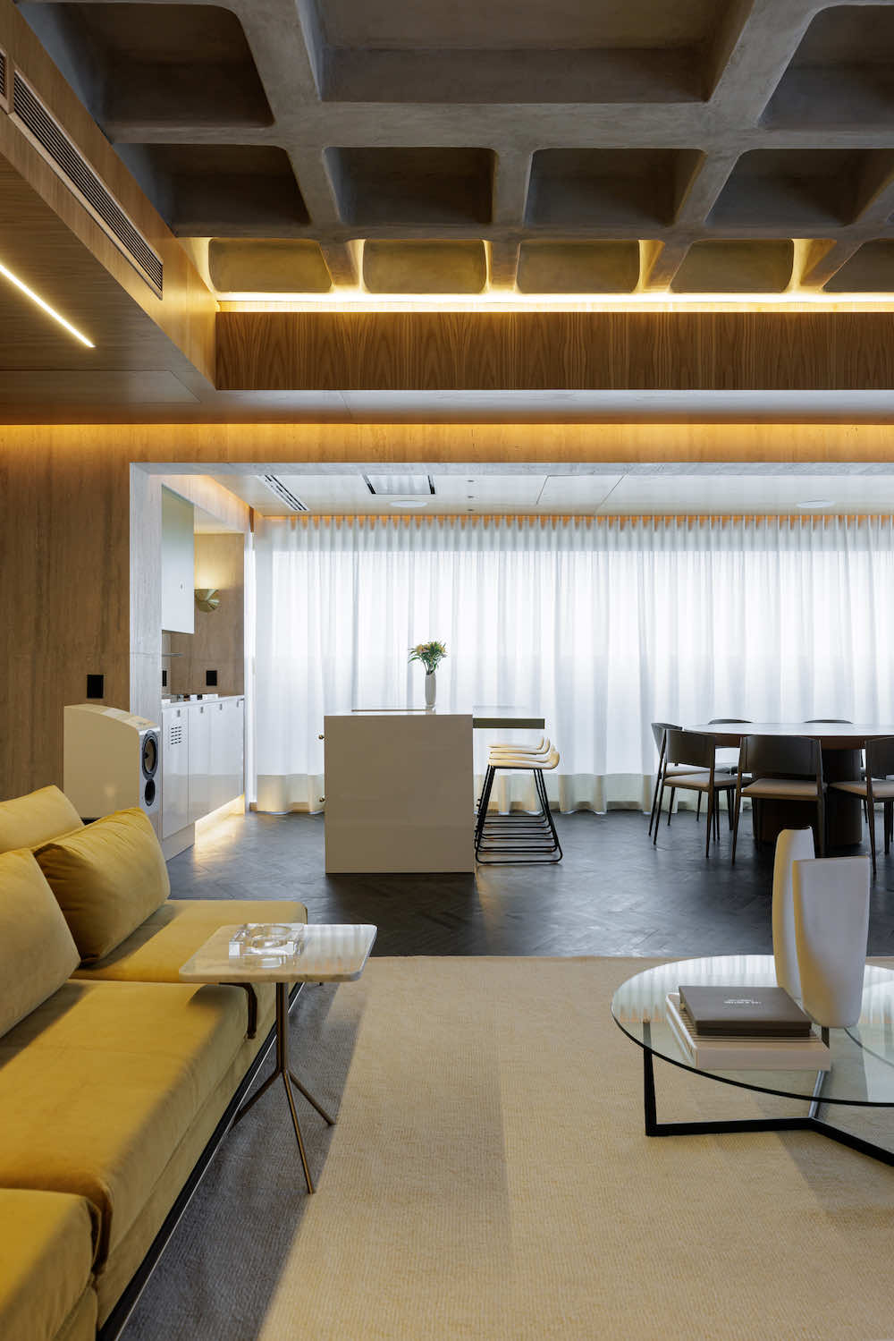 Um apartamento de personalidade. De tons sóbrios, o lugar foi revestido com lâminas de carvalho natural e travertino romano bruto, que é um mármore clássico e atemporal. Também foram usados elementos metálicos variados entre inox escovado, latão escovado e eletrostático preto.
