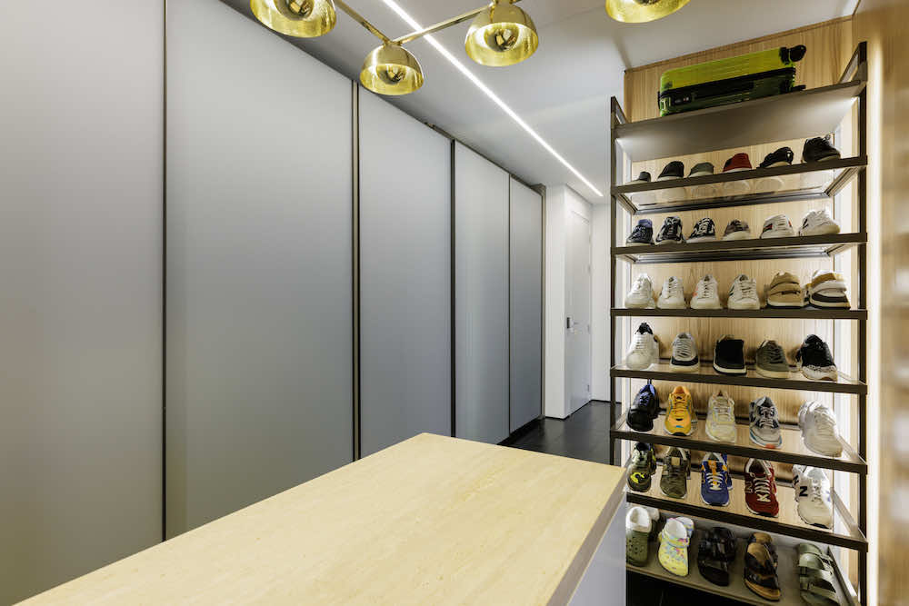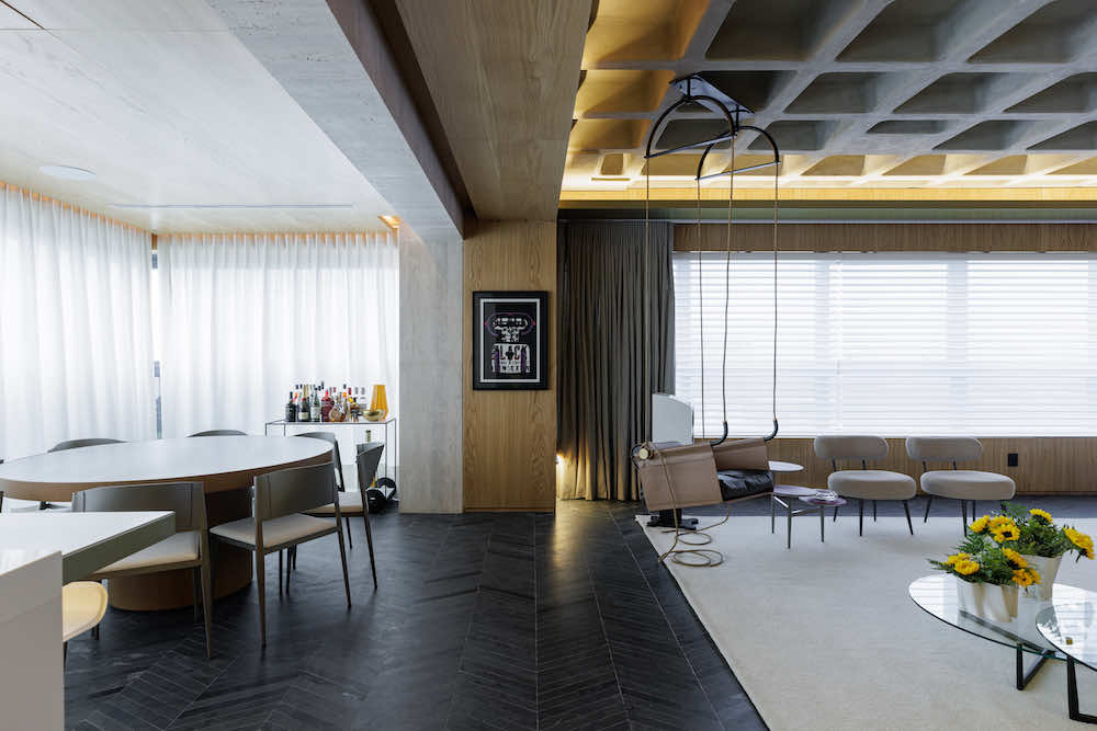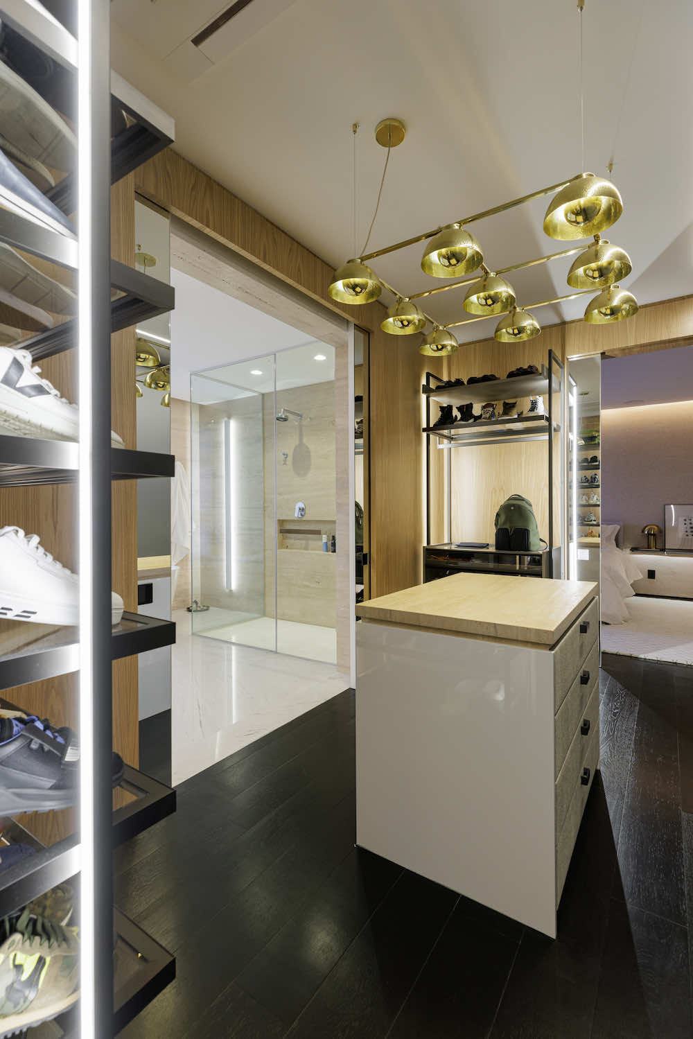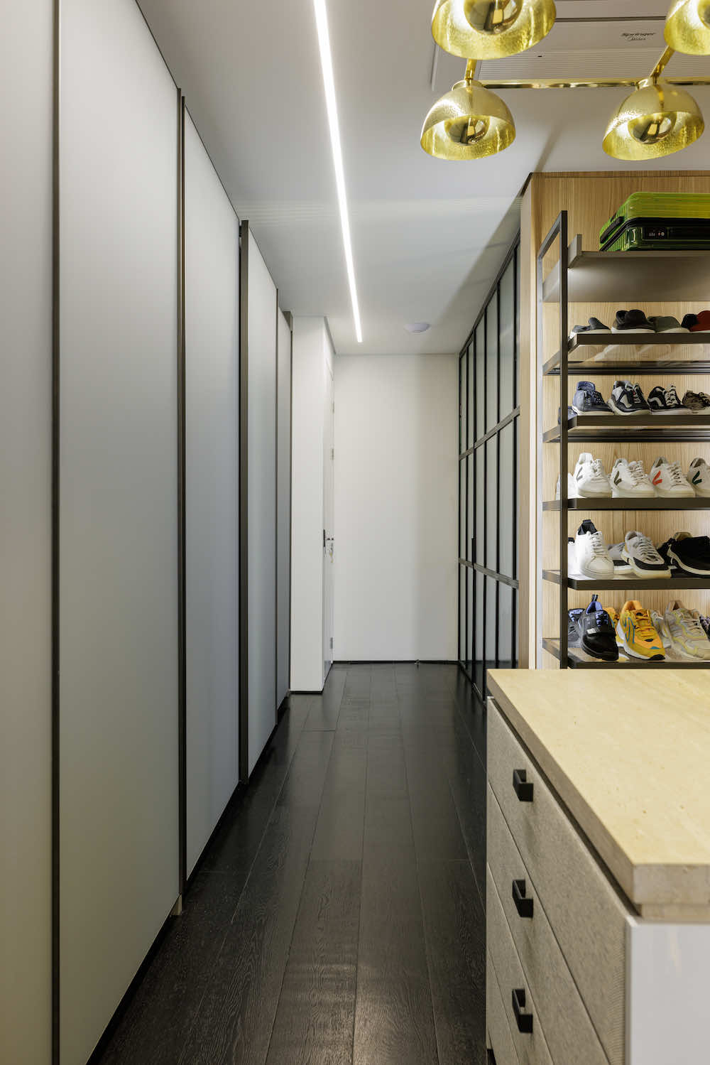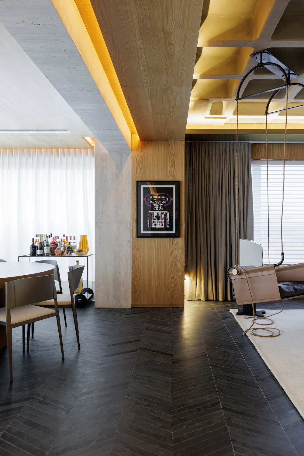 Um apartamento de personalidade. De tons sóbrios, o lugar foi revestido com lâminas de carvalho natural e travertino romano bruto, que é um mármore clássico e atemporal. Também foram usados elementos metálicos variados entre inox escovado, latão escovado e eletrostático preto.