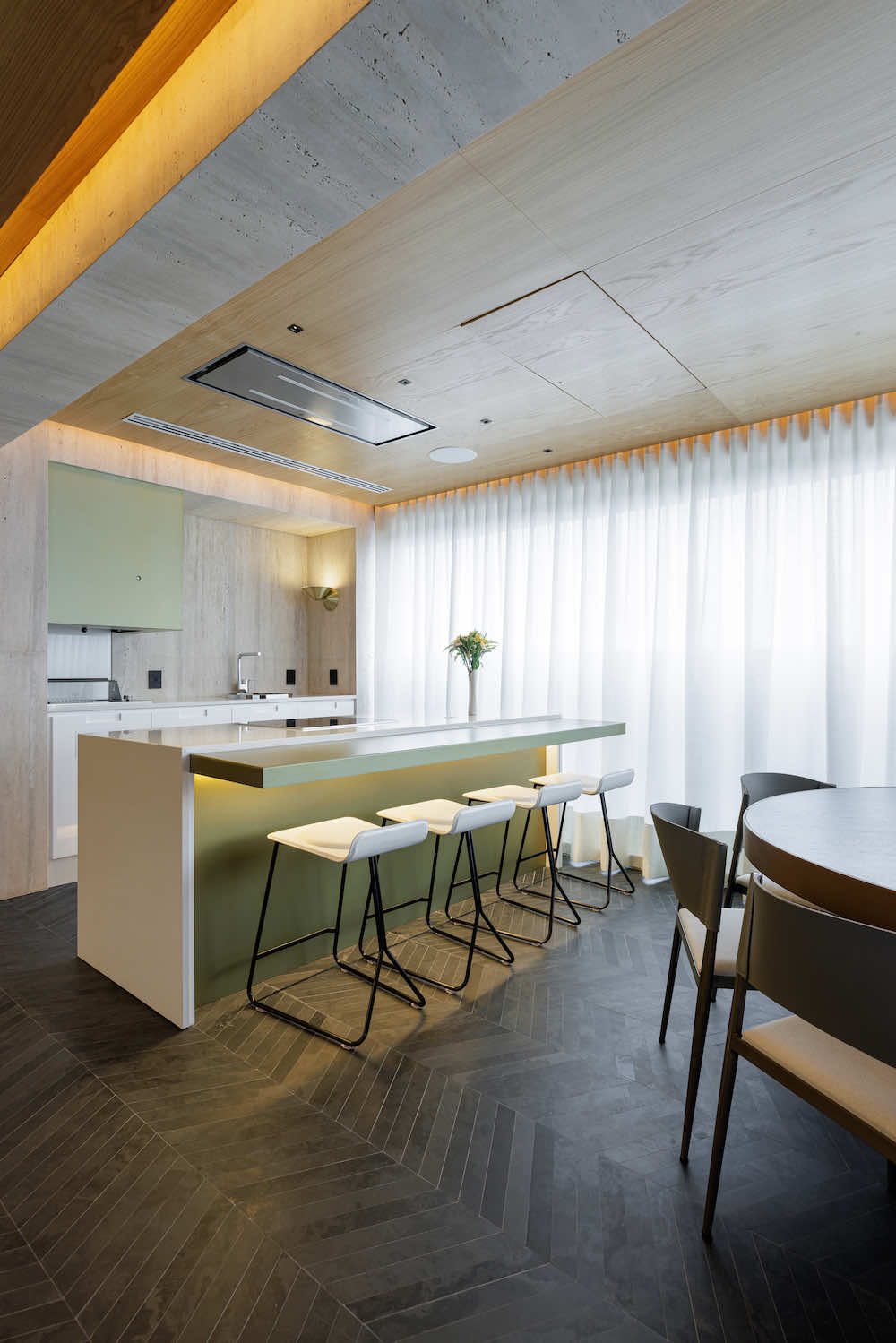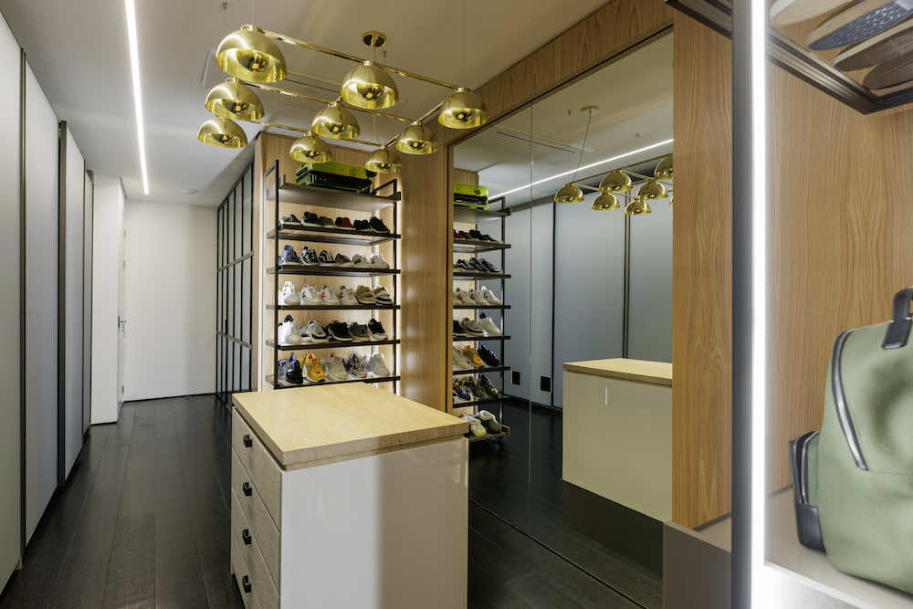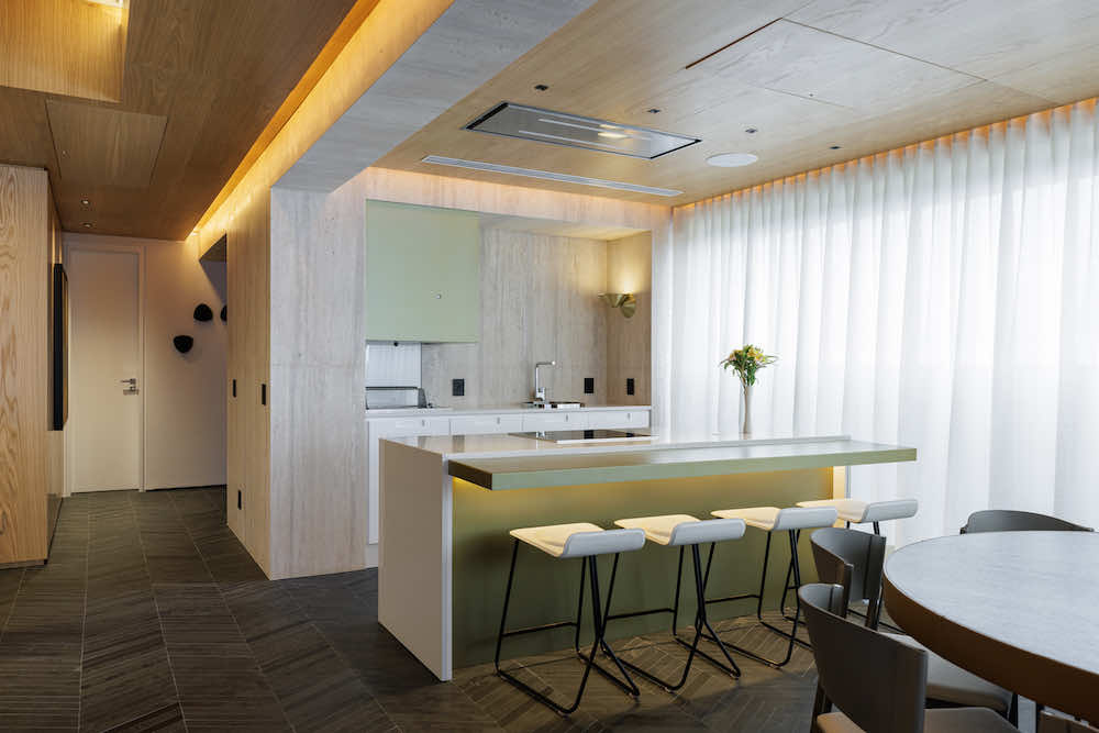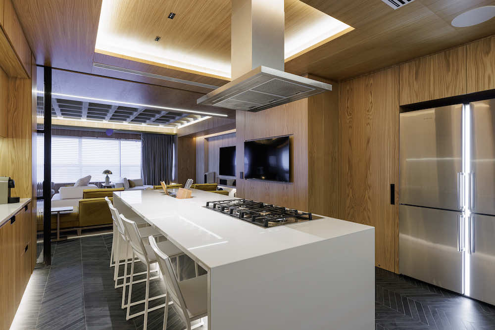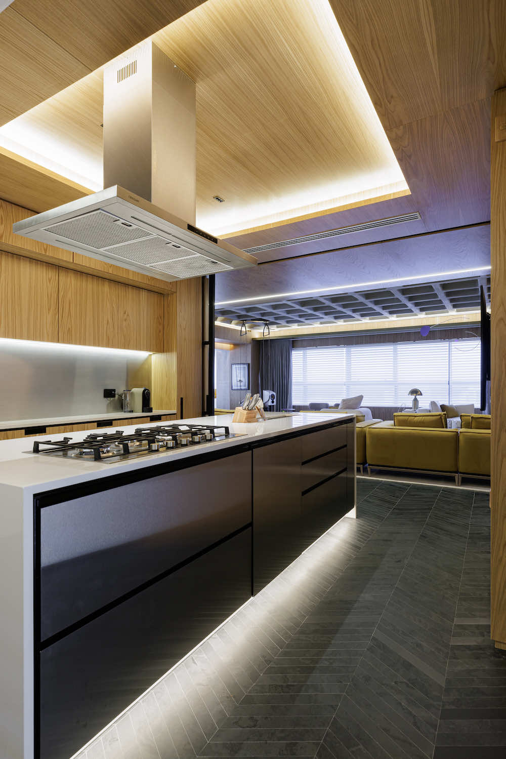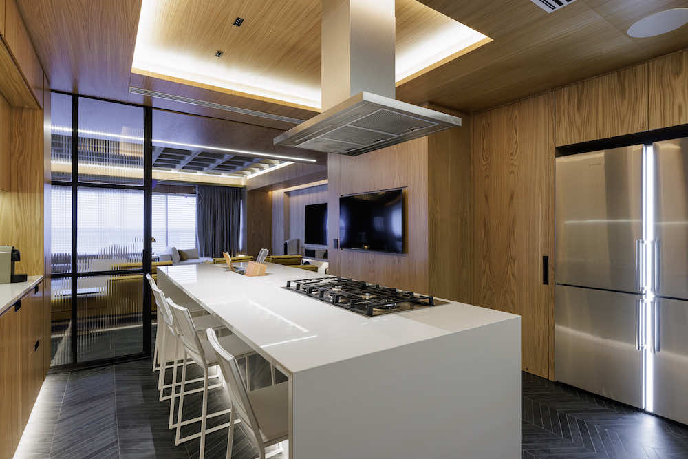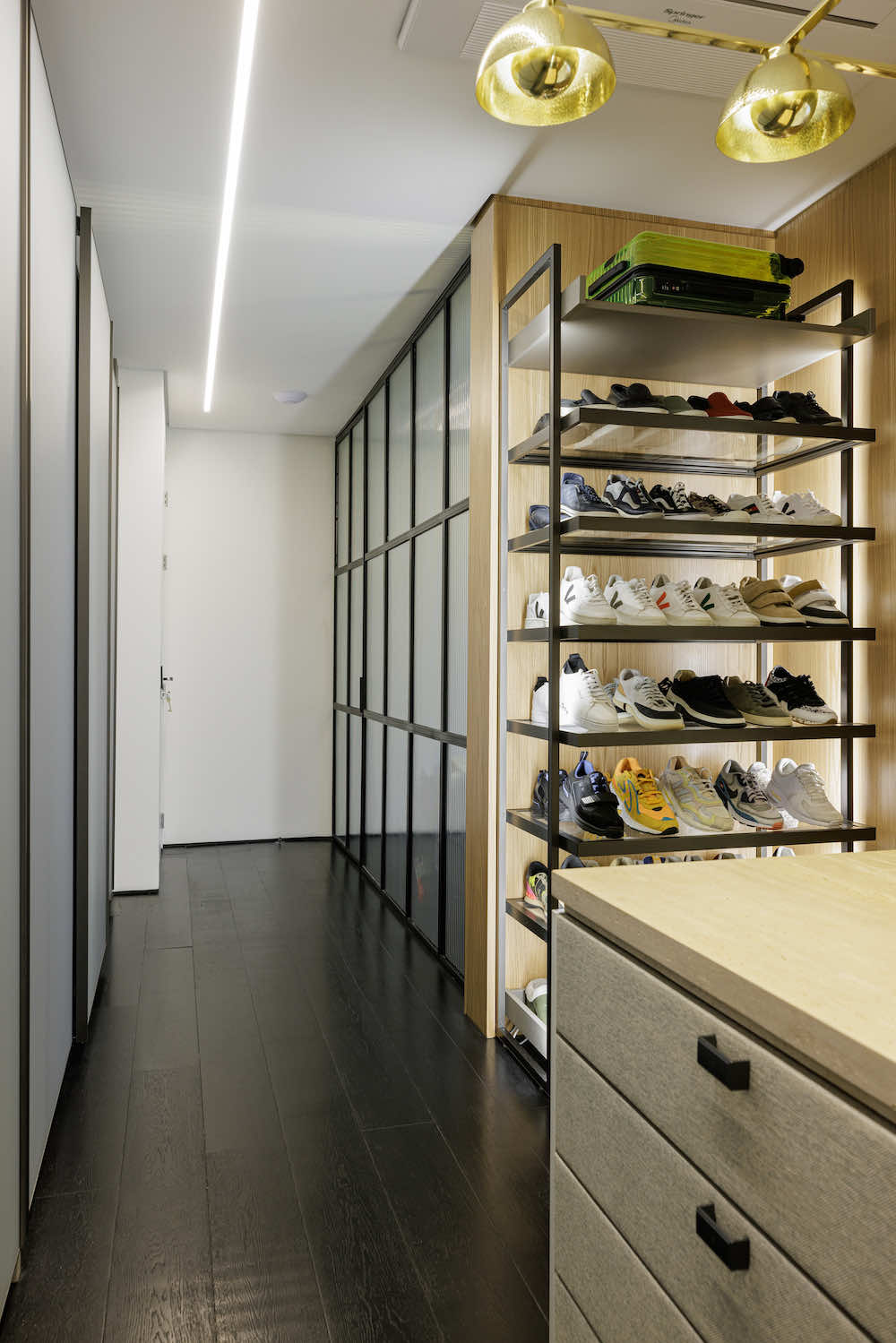 Um apartamento de personalidade. De tons sóbrios, o lugar foi revestido com lâminas de carvalho natural e travertino romano bruto, que é um mármore clássico e atemporal. Também foram usados elementos metálicos variados entre inox escovado, latão escovado e eletrostático preto.