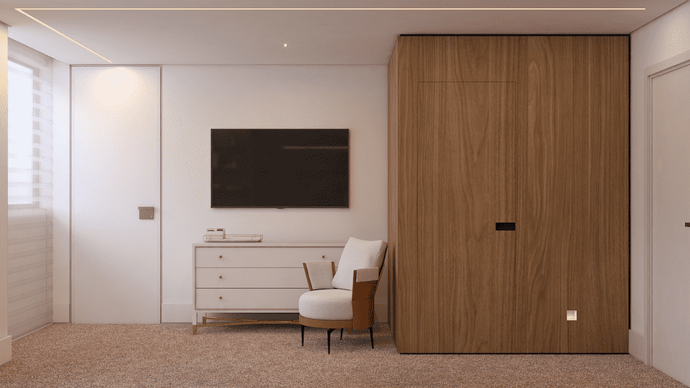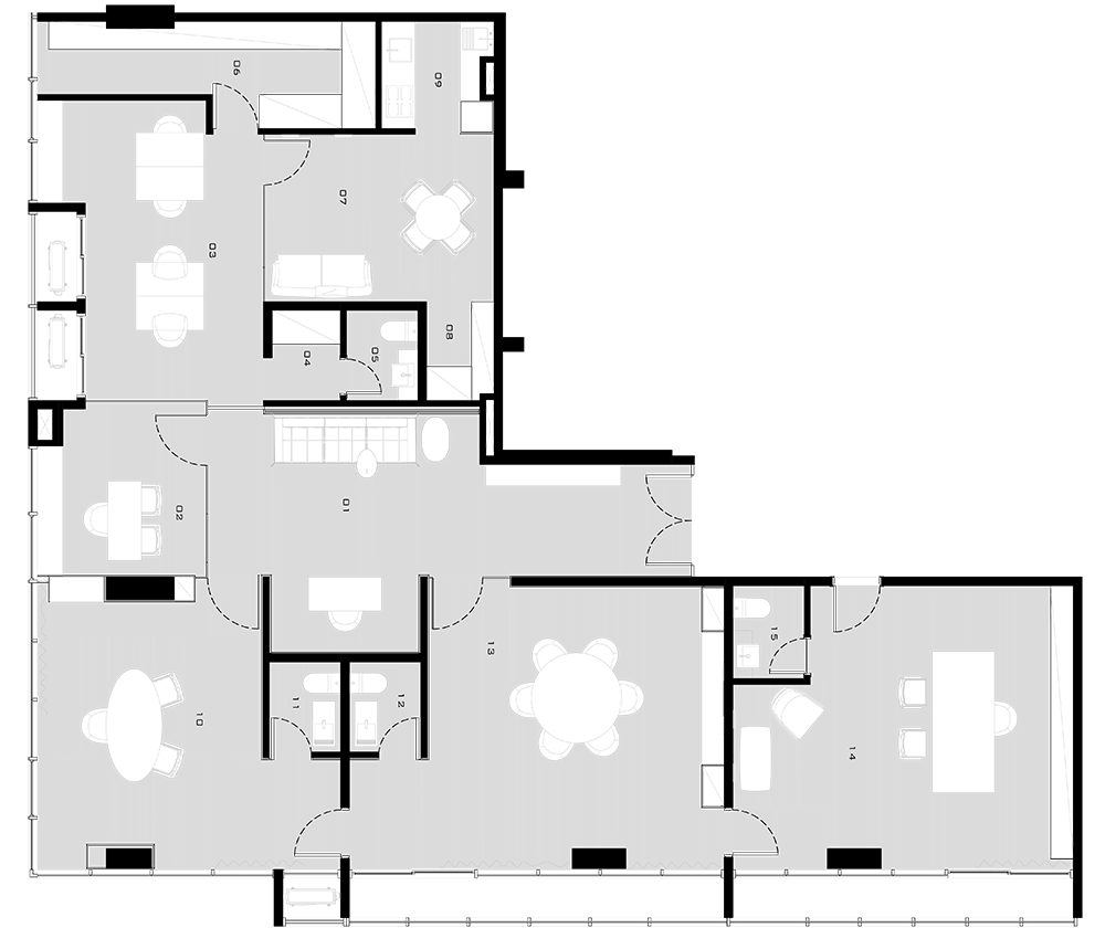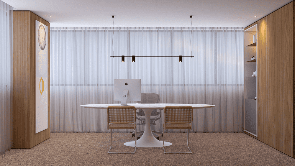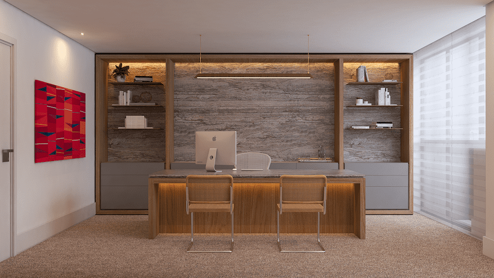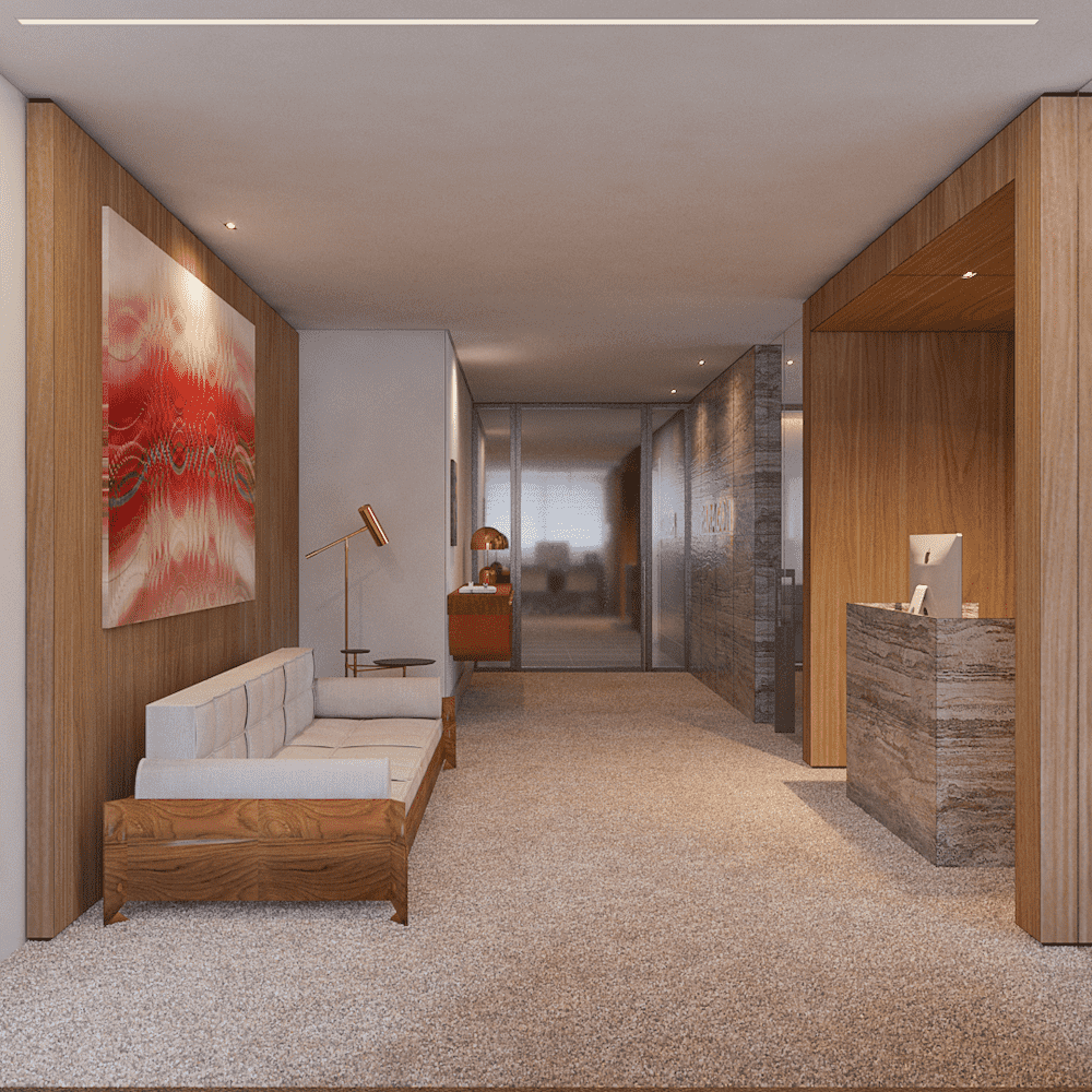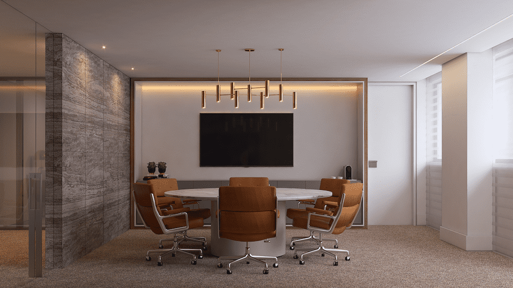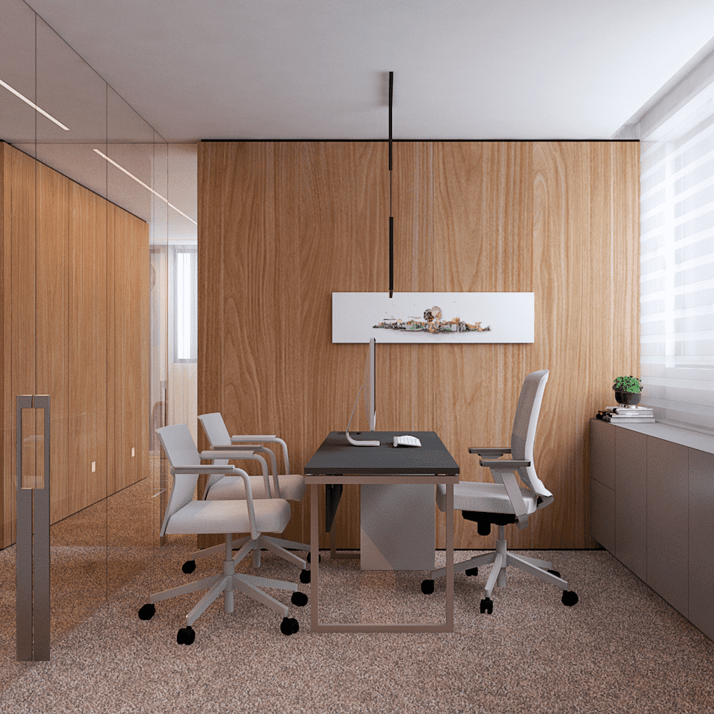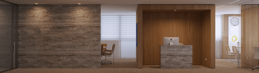 Solidez é o conceito-chave neste projeto, que originalmente envolvia cinco salas comerciais e, no decorrer do tempo, teve um aumento da área construída. Os valores tradicionais da empresa são materializados no interior deste escritório, através de uma composição sóbria, com tonalidades mais escuras e um mobiliário moderno assinado por grandes nomes nacionais.