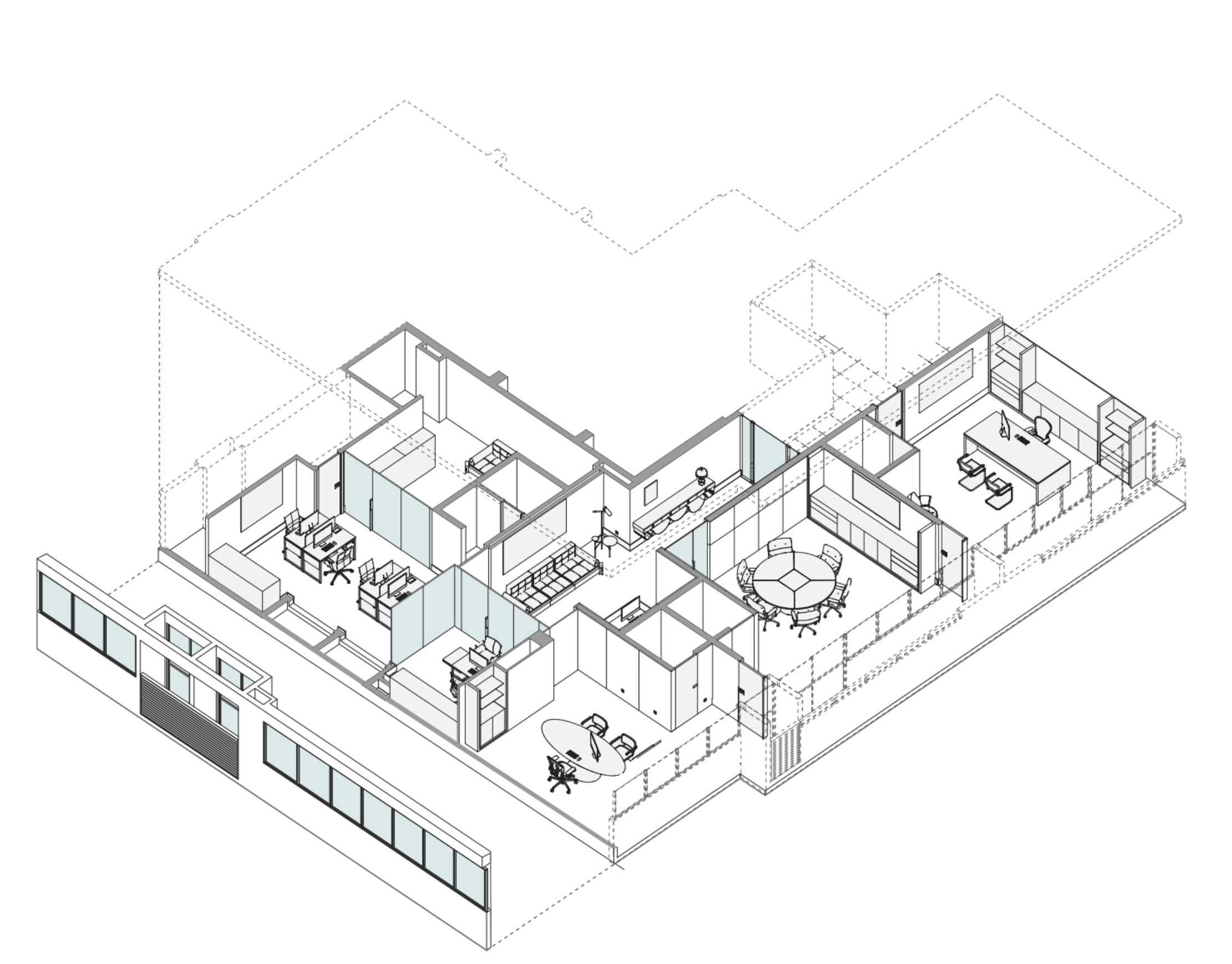 Considerado um espaço transitório, a recepção se torna o coração do lugar, permitindo que os demais ambientes em volta - salas de reunião, produção, gerência e diretoria - recebam mais luz natural, a partir de uma divisão espacial em formato de cubo.