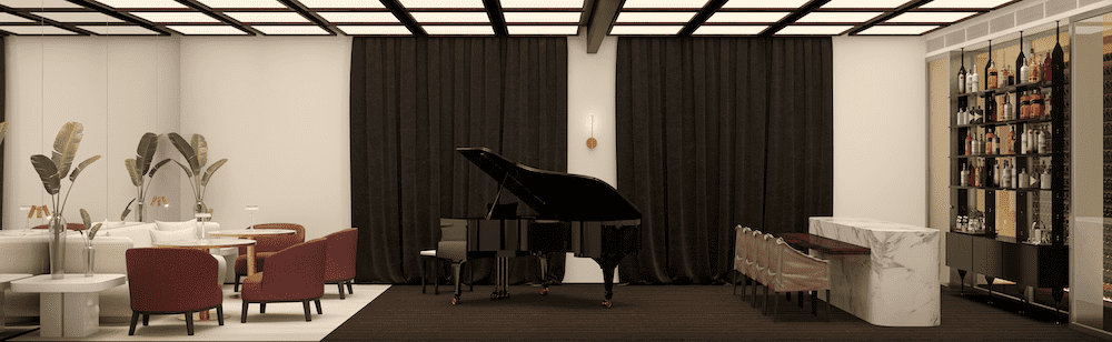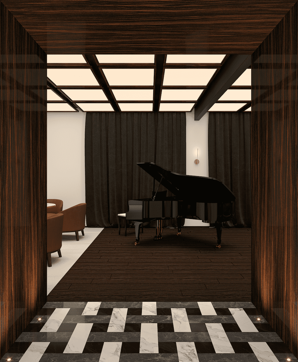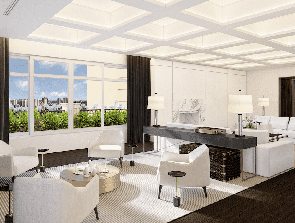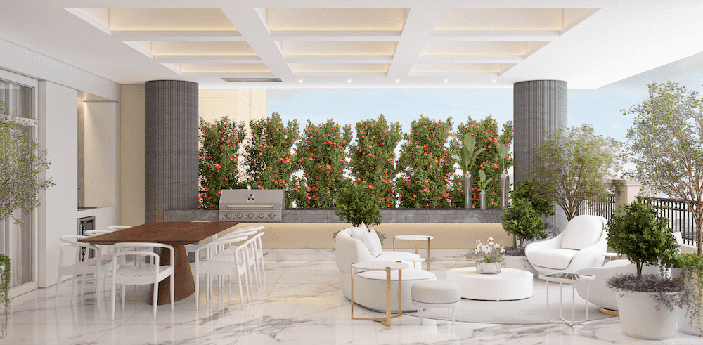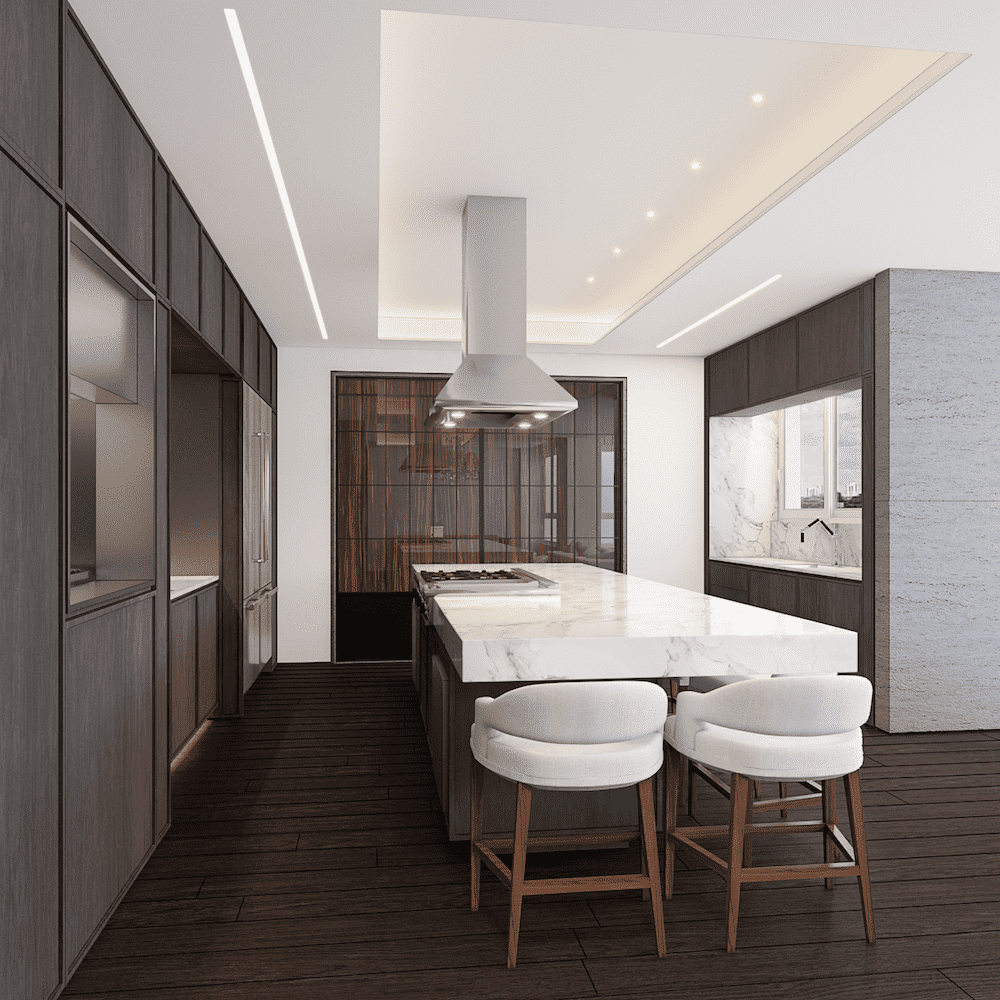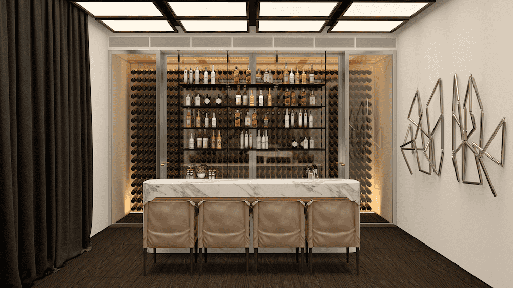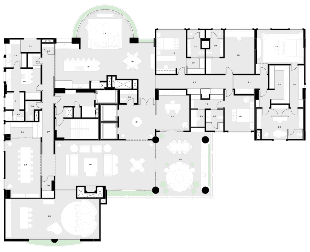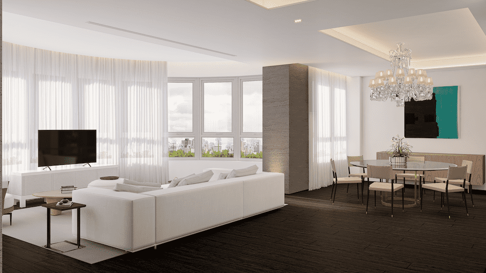 A planta possibilitou separar toda a área social da área íntima, mantendo a circulação no apartamento através de uma galeria e hall de entrada. Estes dois espaços transitórios conectam o living, sala de jantar e piano bar com a sala de TV, sala de almoço e cozinha gourmet.