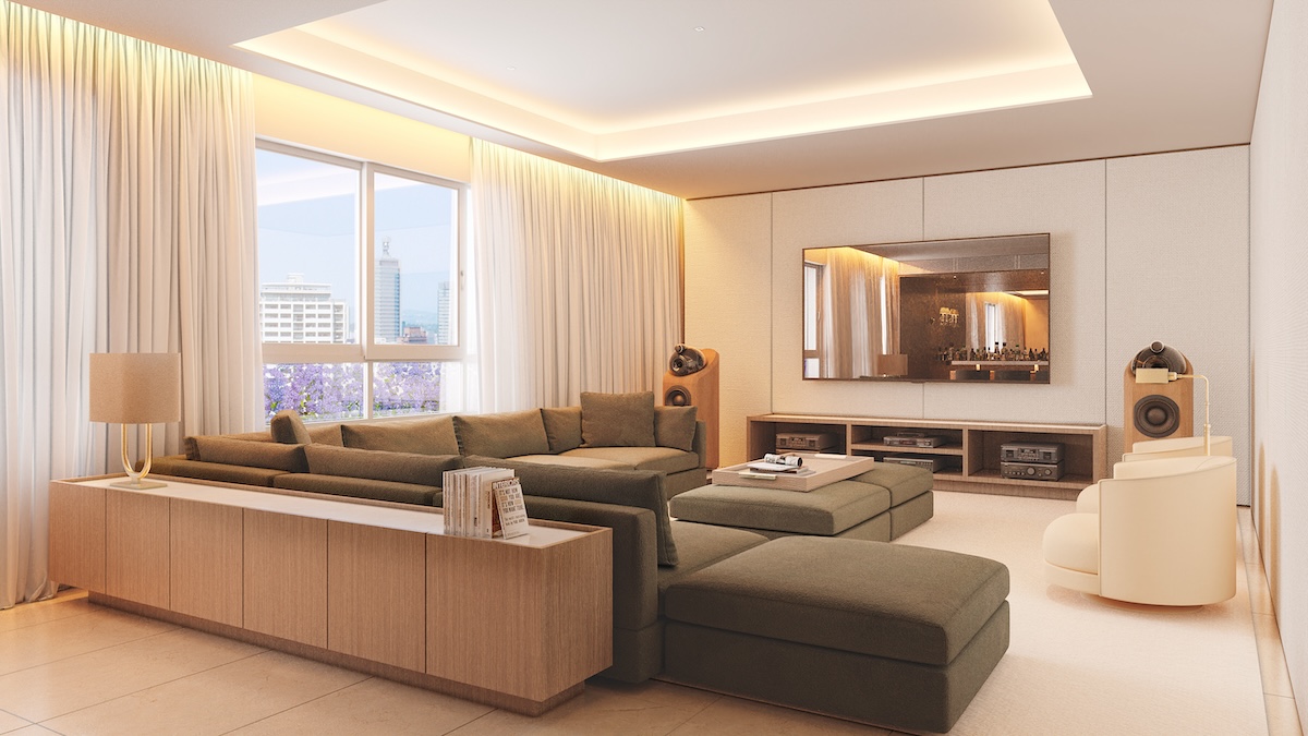 Por interesse do cliente, o home theater também recebeu um cuidado especial. Os tecidos, as madeiras e todos os outros materiais envolvidos foram minuciosamente selecionados na intenção de que o home theater virasse uma caixa acústica sem nenhum ruído ou trepidação.