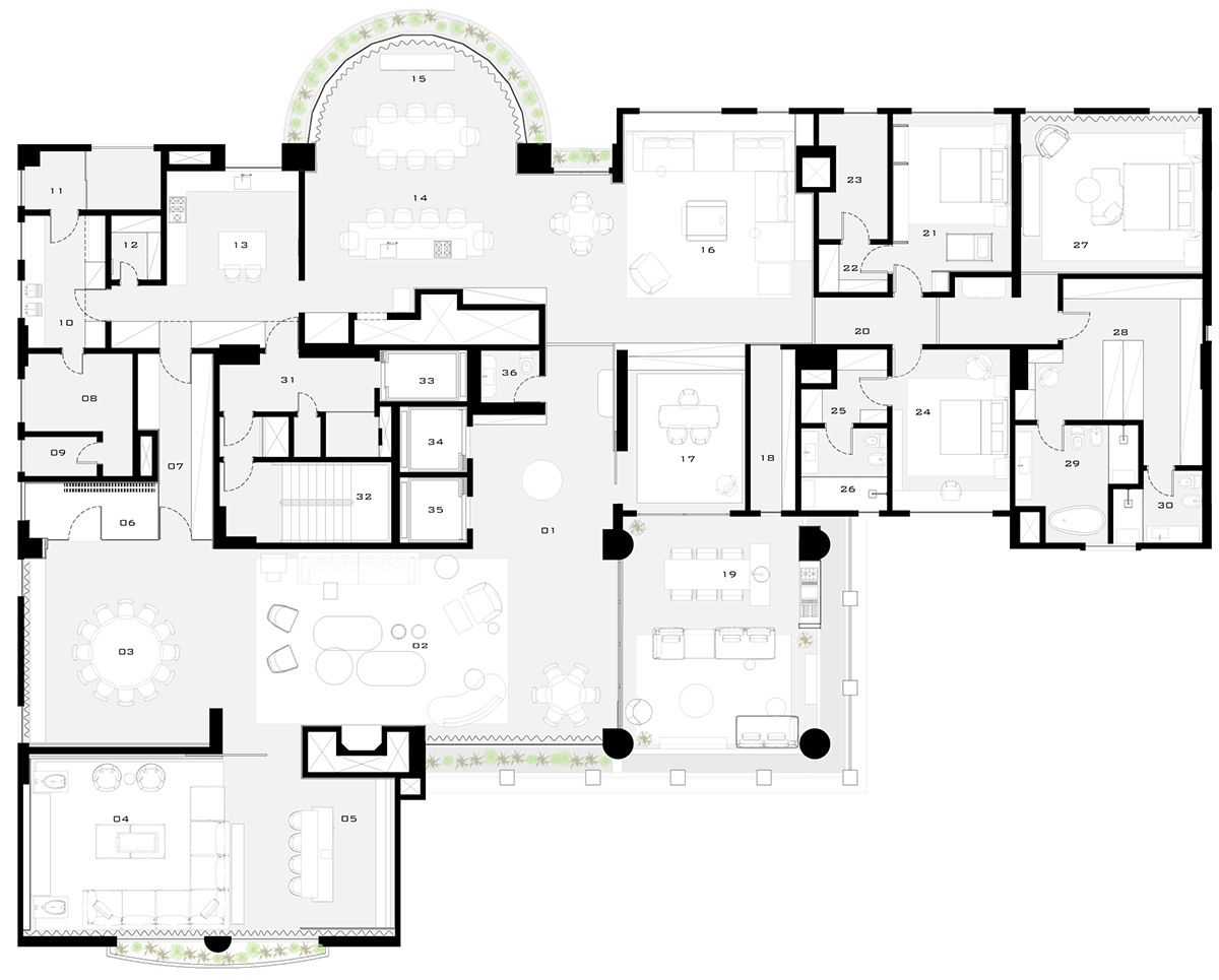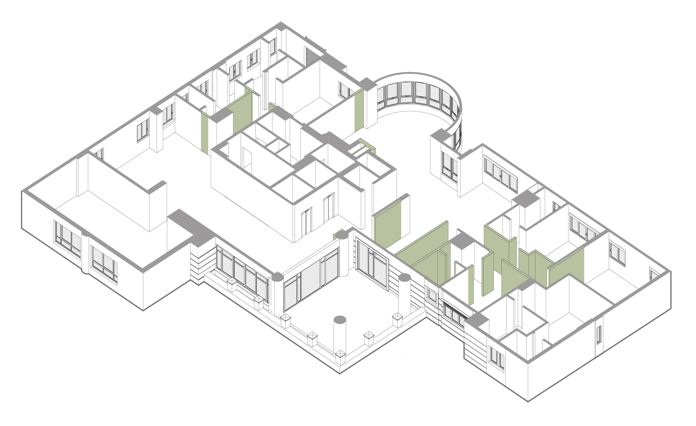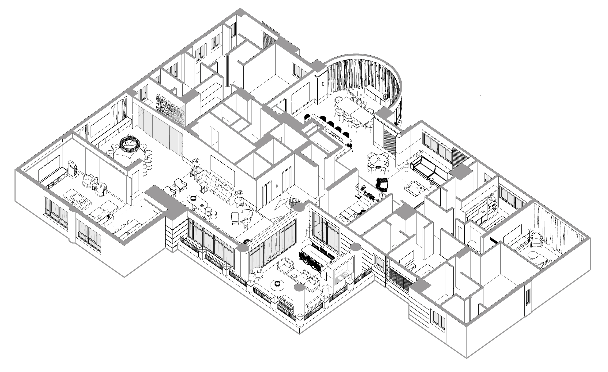 Os quatro quartos que haviam no imóvel se transformaram em três grandes suítes. Os espaços do apartamento também foram trabalhados para usos distintos. Esta estrutura permite que, por exemplo, o filho receba amigos em um ambiente informal e que, ao mesmo tempo, o casal possa escutar música em outra sala.