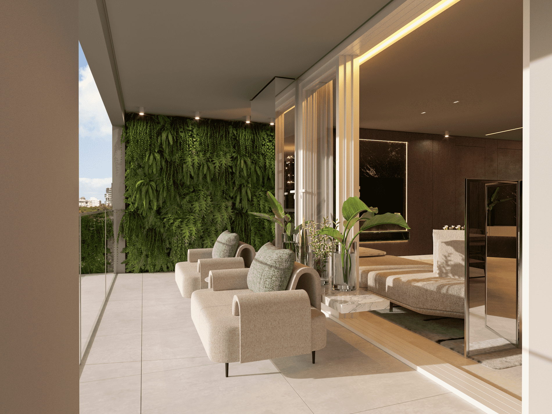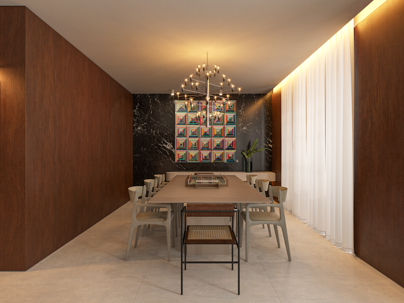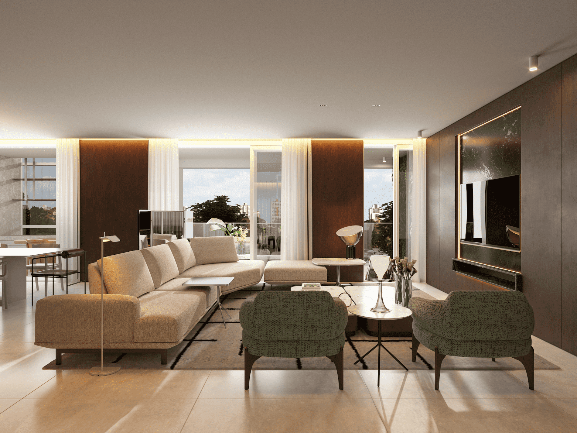 Houve uma reforma total, integrando visualmente todas as salas do andar de baixo. O piso de madeira escura faz contraste com as tonalidades claras nos demais elementos do apartamento, realçando a iluminação natural.