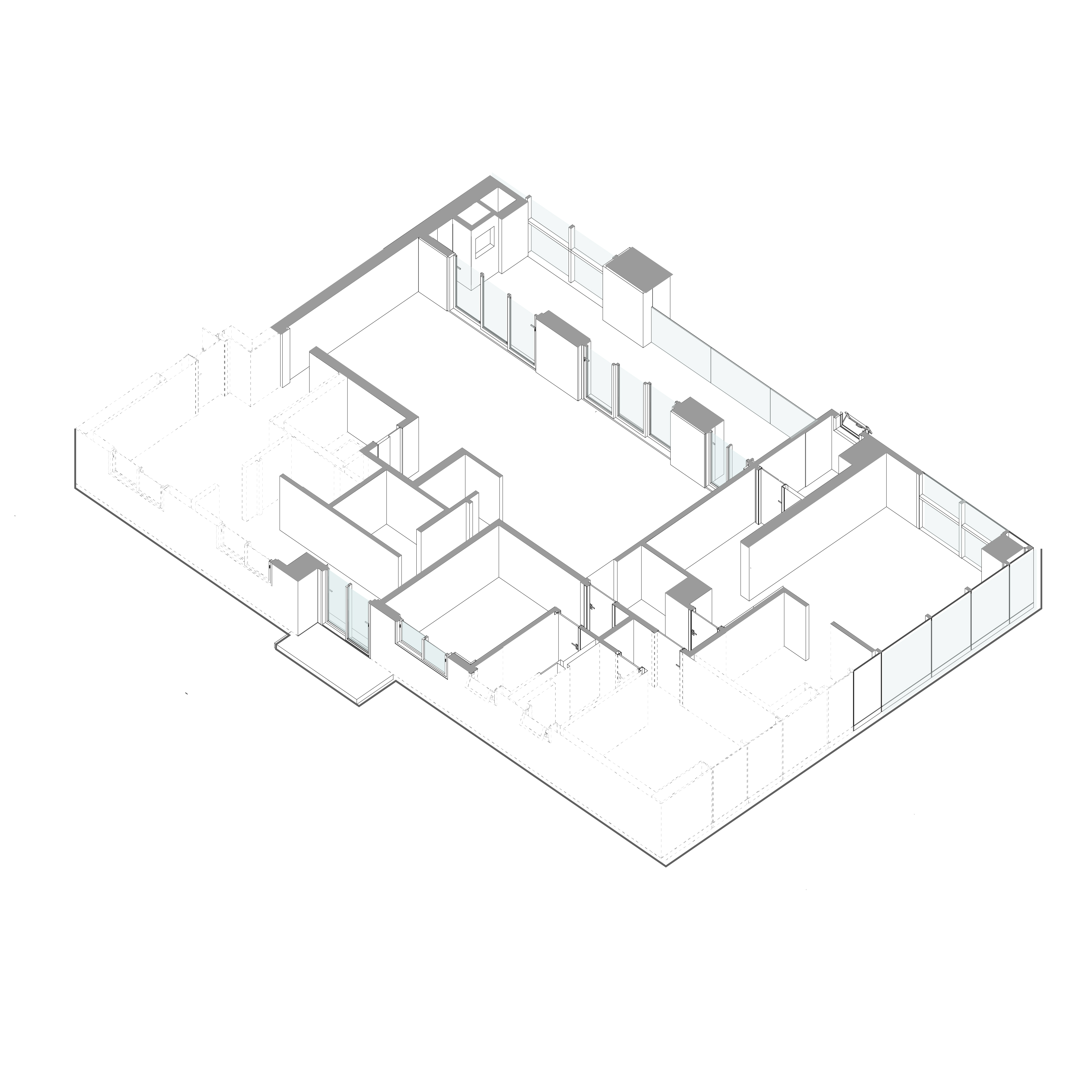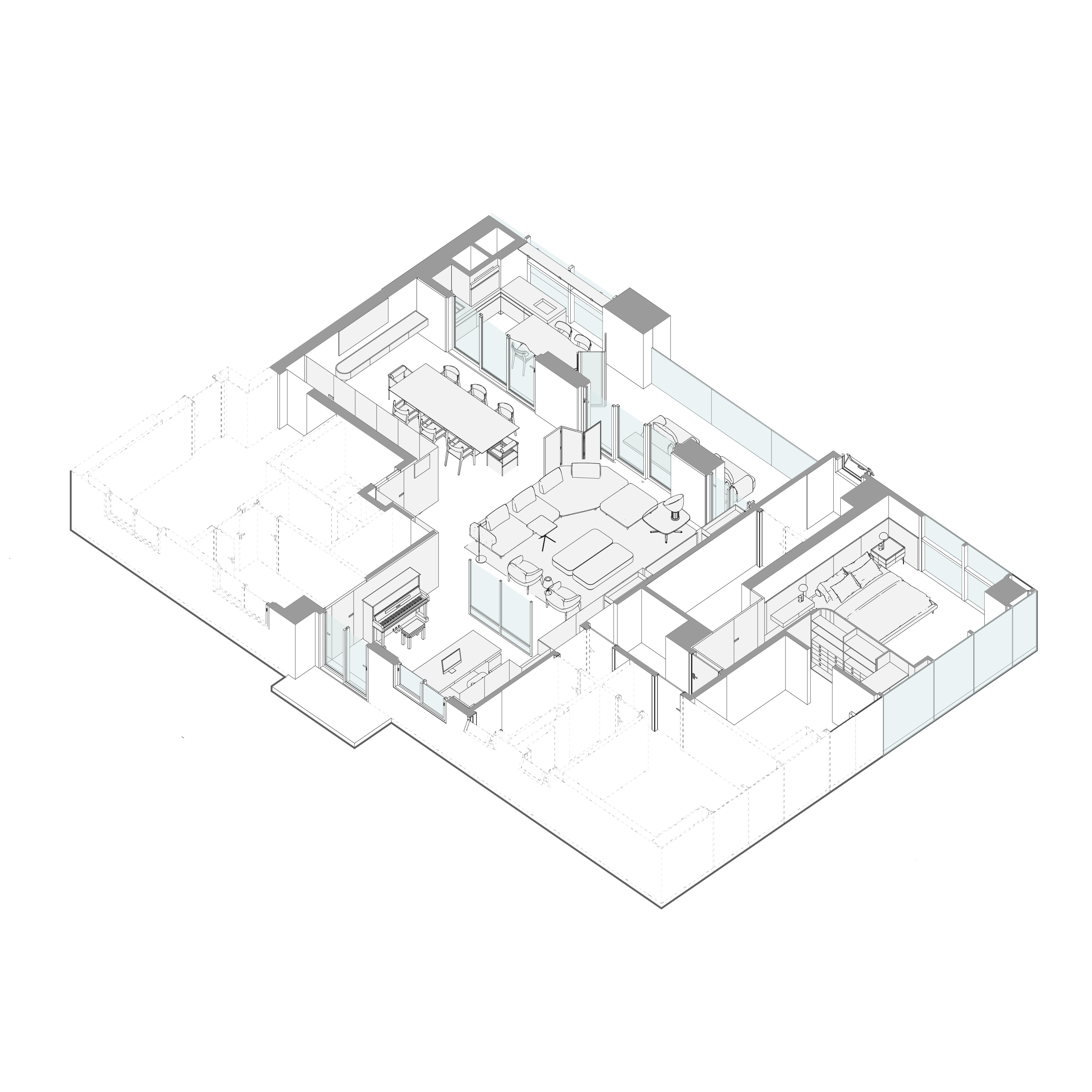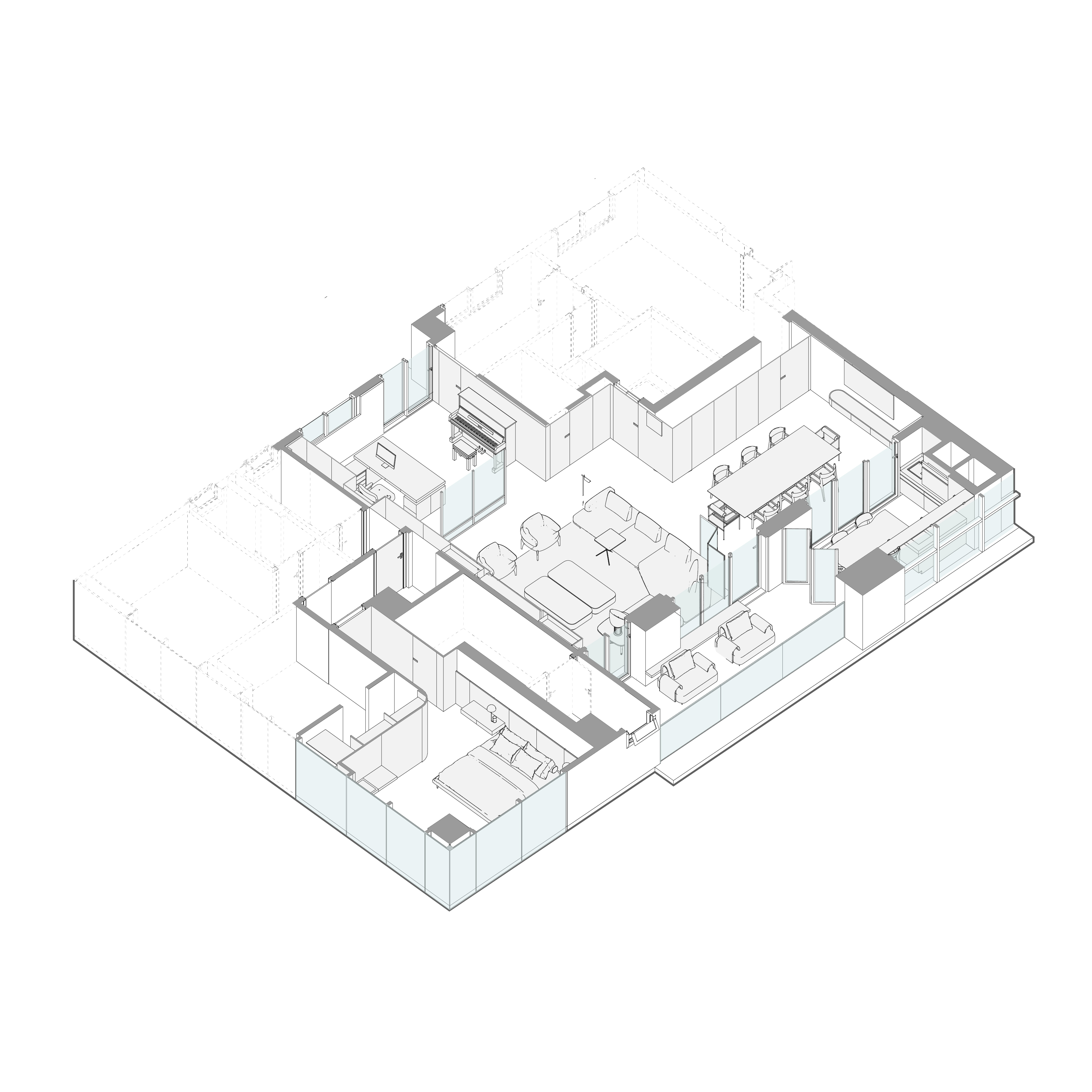 Neste duplex da década 1980, existia uma configuração antiquada em relação às vias de circulação, que acabavam tomando demasiado espaço. Por isso, a renovação desse apartamento envolveu um trabalho cuidadoso referente ao fluxo de pessoas.